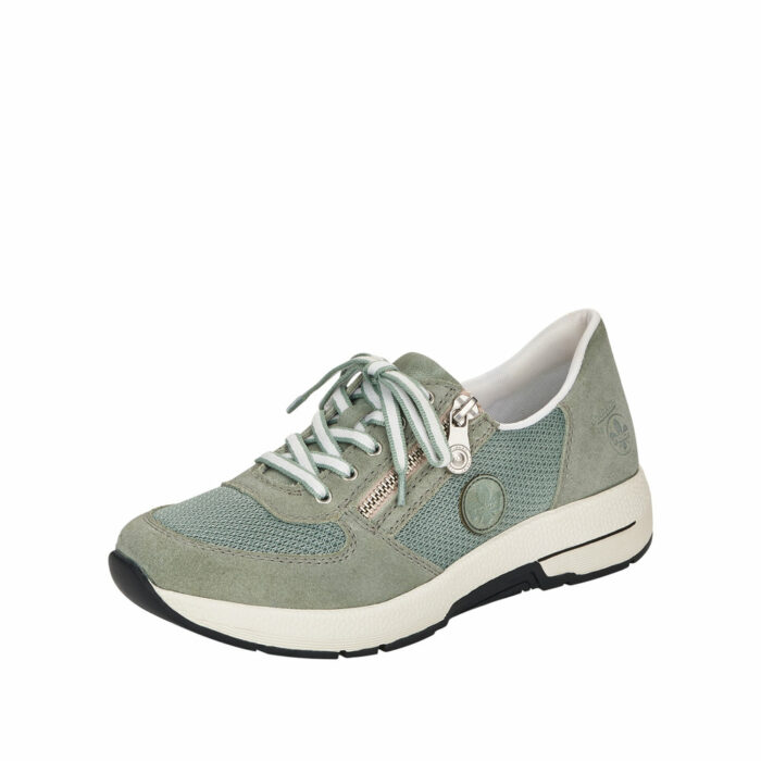 Rieker sneakers i grøn til dame. Lækker let sneakers med fine detaljer. Modellen har både snøre og en funktionel lynlås på ydersiden, som gør det nemt at komme i/af skoen. En dejlig Rieker sneakers med en god solid bund samt en blød stødabsorberende lædersål.
