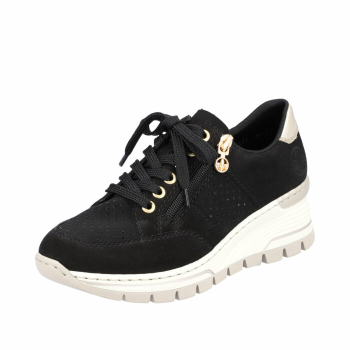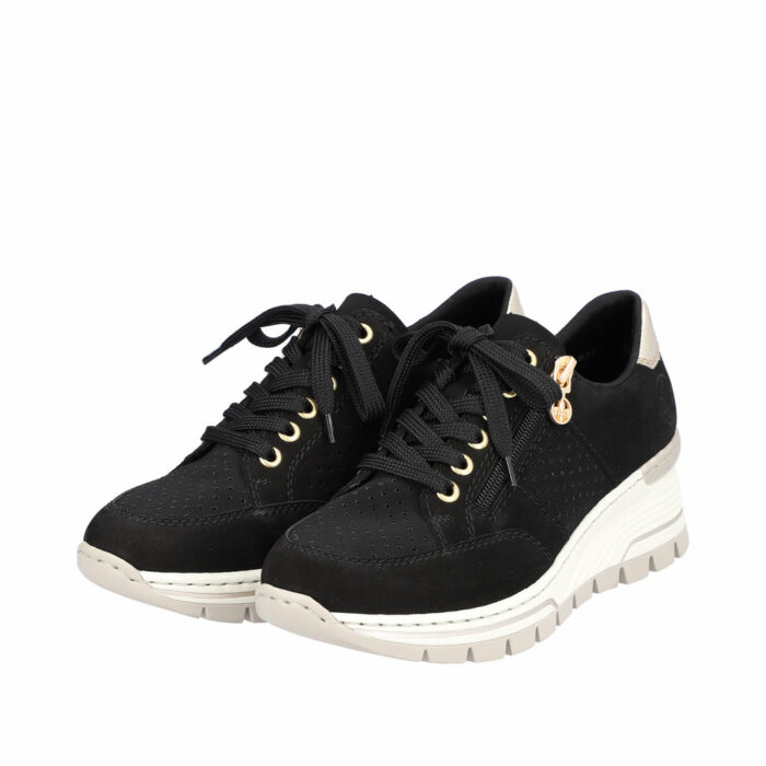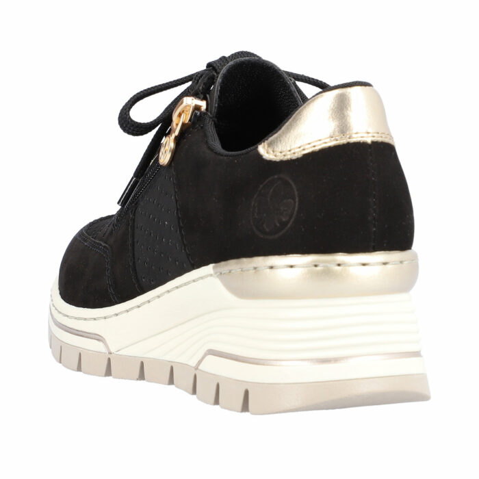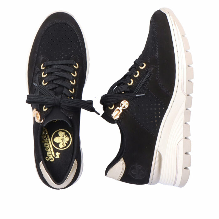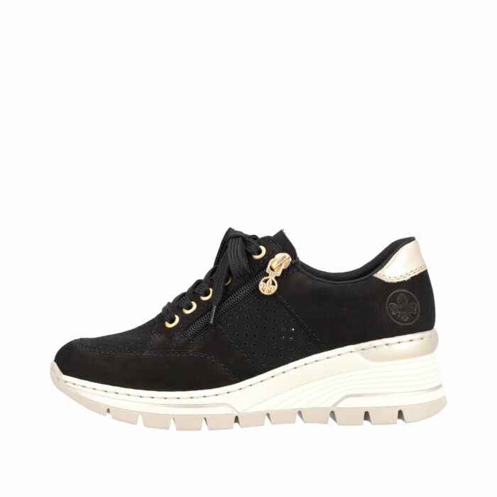 Rieker sneakers i sort til dame. Lækker sneakers med flotte gulddetaljer. Modellen har en funktionel lynlås på ydersiden samt snøre foran, der gør det let at komme i/af skoen. Modellen har en stødabsorberende sål med en lille hælhøjde, hvilket bidrager til ekstra komfort og støtte.