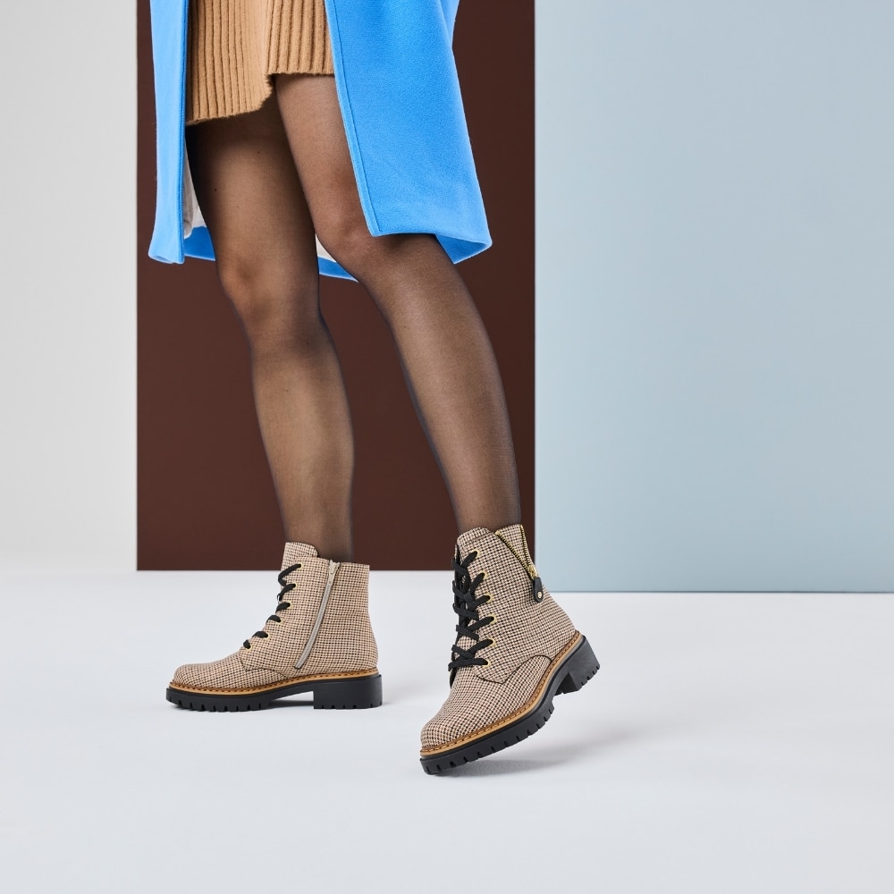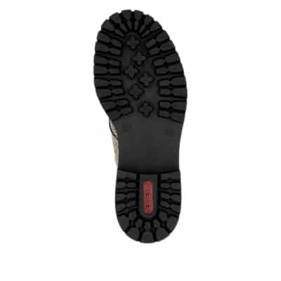 Rieker støvle til dame i beige. En stilfuld og funktionel støvle til hverdagsbrug. Modellen er designet med både snørebånd og en praktisk lynlås, så støvlen er let at tage af og på. Indvendigt får du en blød sål og en let foring, der giver god komfort fra morgen til aften. Takket være Rieker Antistress er støvlen let og fleksibel, og den mønstrede ydersål øger både stødabsorbering og skridsikkerhed.