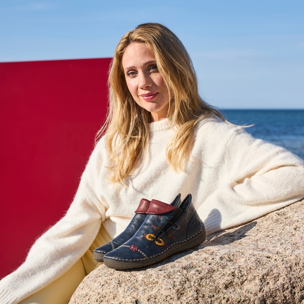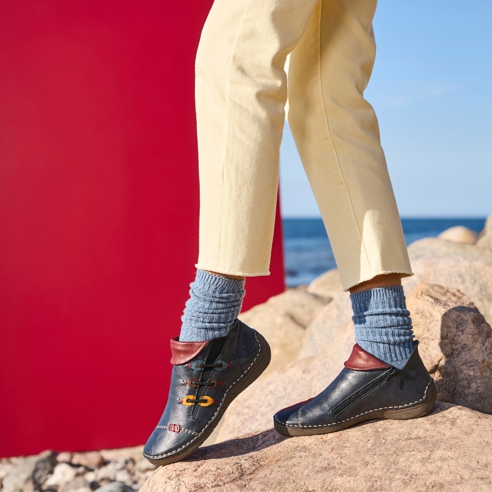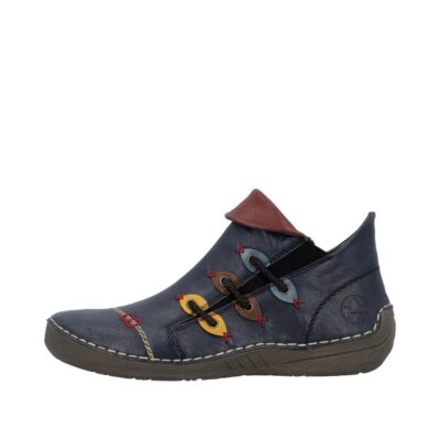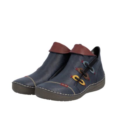 Rieker støvle til dame i blå. Disse blå støvler fra Rieker er et godt valg til hverdagen. Modellen er nem at bruge med lynlås på indersiden og elastik på ydersiden, så du hurtigt kan få den af og på. Indvendigt sørger en let foring og en blød Rieker soft sål for, at komforten er i top hele dagen. Ydersålen har et mønster, der både øger stødabsorbering og skridsikkerhed.