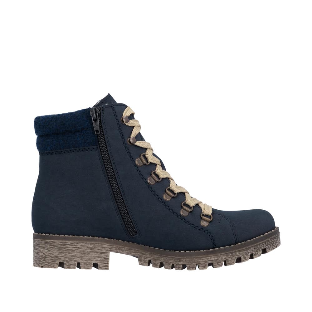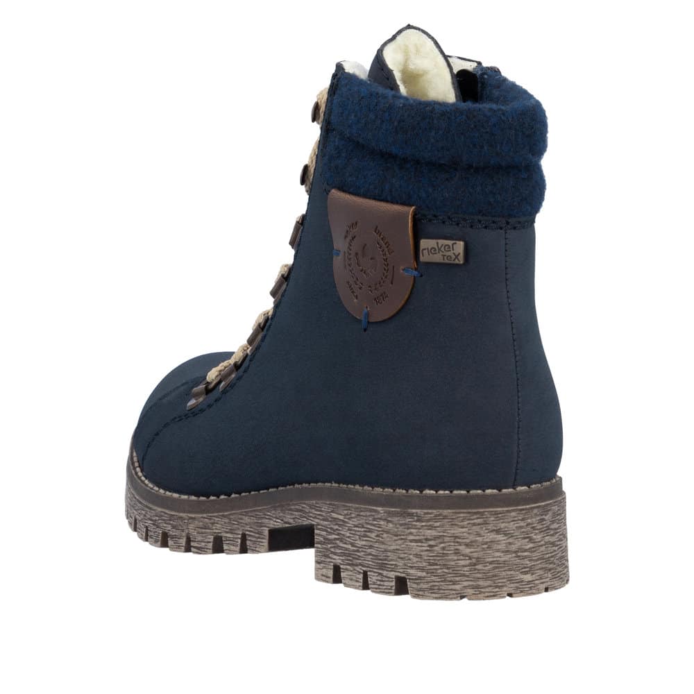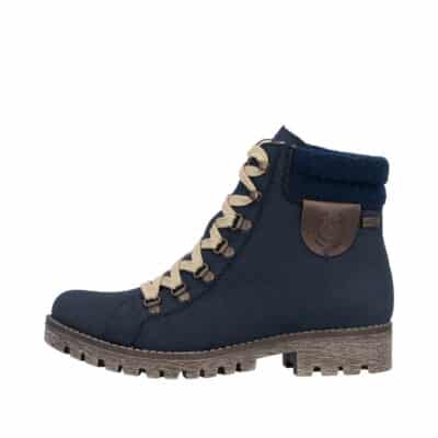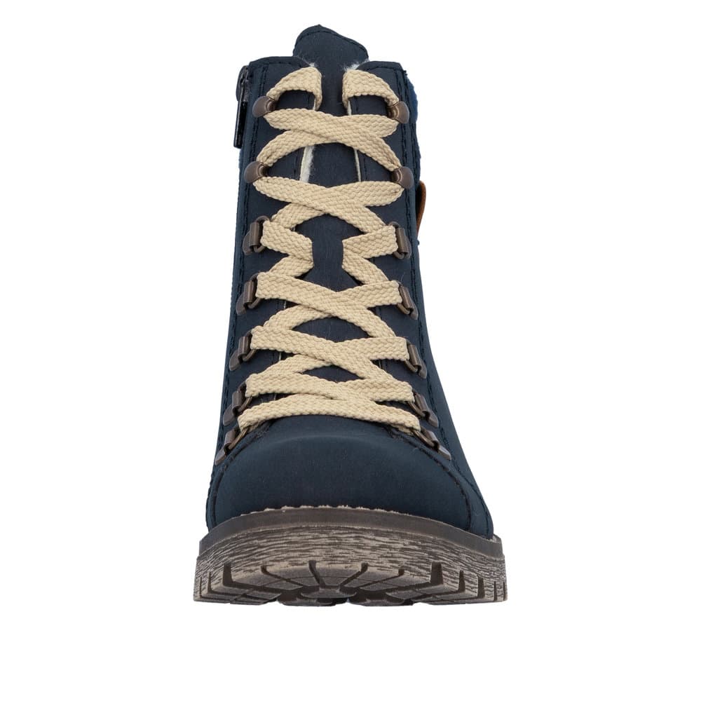 Rieker støvle til dame i blå. Denne mørkeblå vinterstøvle er et populært valg med sit enkle design og moderne detaljer. Snørebåndene foran giver en pasform, der kan tilpasses, mens den funktionelle lynlås gør støvlen nem at tage på. Indvendigt holder en varm foring dine fødder behageligt lune, og Rieker-Tex teknologien giver kraftig vandafvisning. Den stærke ydersål med mønster og stødabsorbering fuldender designet og giver både støtte og øget skridsikkerhed.