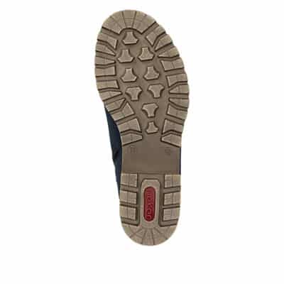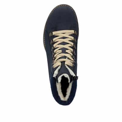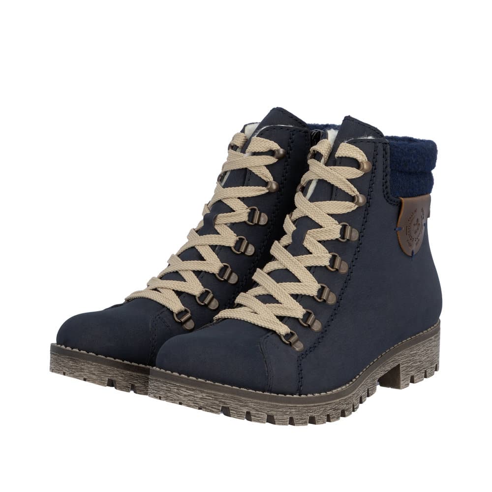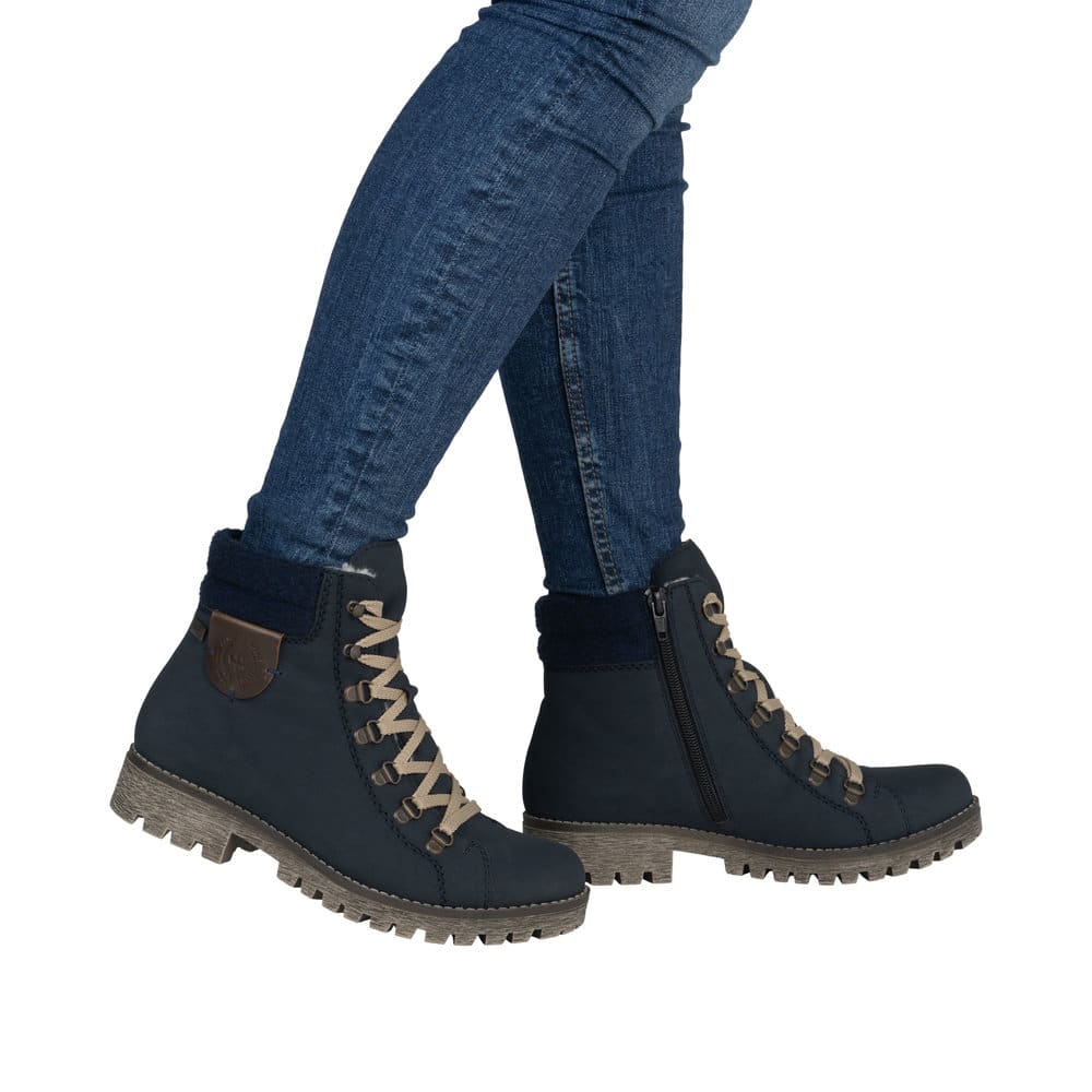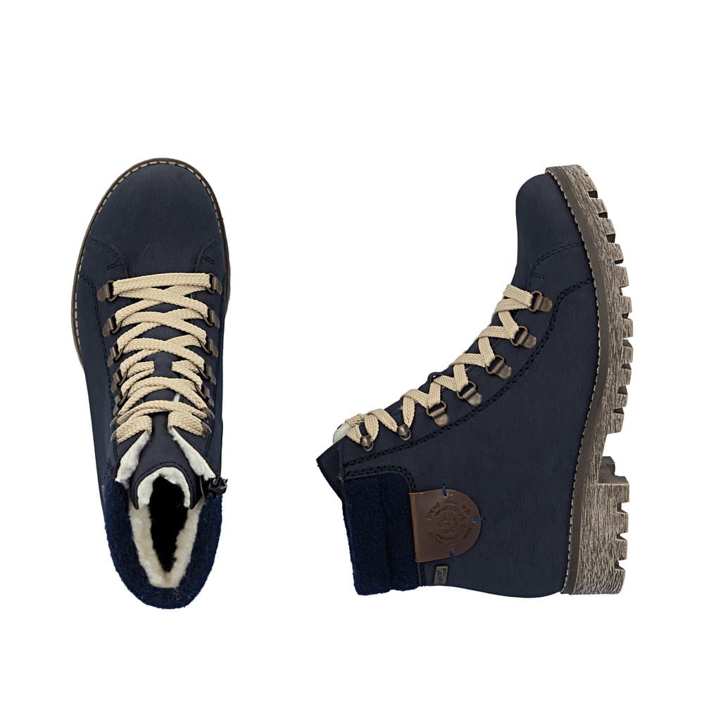 Rieker støvle til dame i blå. Denne mørkeblå vinterstøvle er et populært valg med sit enkle design og moderne detaljer. Snørebåndene foran giver en pasform, der kan tilpasses, mens den funktionelle lynlås gør støvlen nem at tage på. Indvendigt holder en varm foring dine fødder behageligt lune, og Rieker-Tex teknologien giver kraftig vandafvisning. Den stærke ydersål med mønster og stødabsorbering fuldender designet og giver både støtte og øget skridsikkerhed.