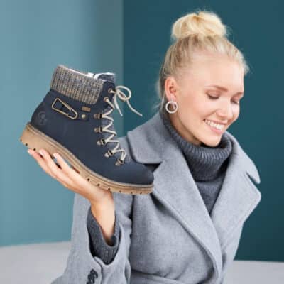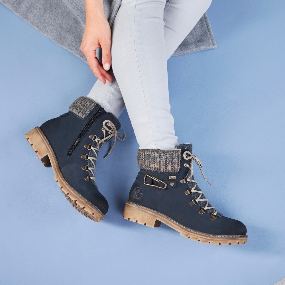 Rieker støvle til dame i blå. Disse blå snørestøvler fra Rieker er både stilfulde og funktionelle, ideelle til hverdagens udfordringer. Snørebåndene og lynlåsen gør det nemt at justere støvlerne for den bedste pasform, samtidig med at de giver god støtte. Skoens elegante detaljer på siden giver et ekstra strejf af stil. Den slidstærke sål med godt greb og den bløde indlægssål sikrer komfort hele dagen. Med en varm foring der holder kulden ude, og RiekerTEX-teknologien, der holder fødderne tørre, er disse støvler det perfekte valg til kølige dage.