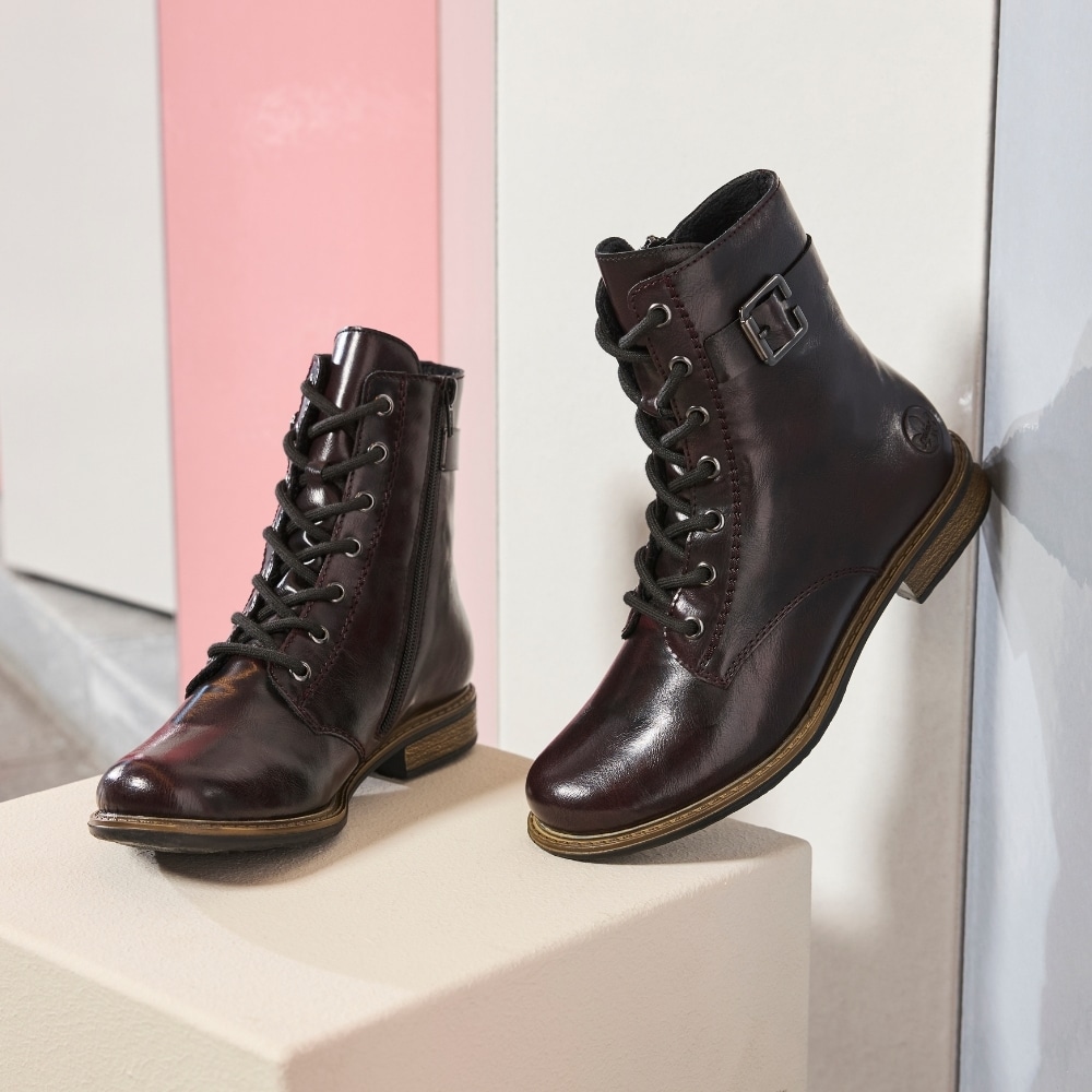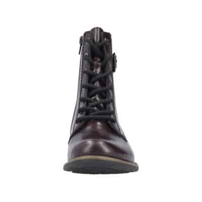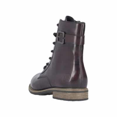 Rieker støvle til dame i bordeaux. Flot støvle i bordeaux med moderne detaljer og praktiske funktioner. Spændet på siden giver et stilfuldt udtryk, mens snørebånd og lynlås på indersiden gør det nemt at tilpasse pasformen. Indvendigt møder du en varm foring og en blød udtagelig sål, som giver god komfort gennem hele dagen. Den ekstra bredde (H) giver rummelighed til foden, mens den mønstrede ydersål giver øget stødabsorbering og skridsikkerhed.