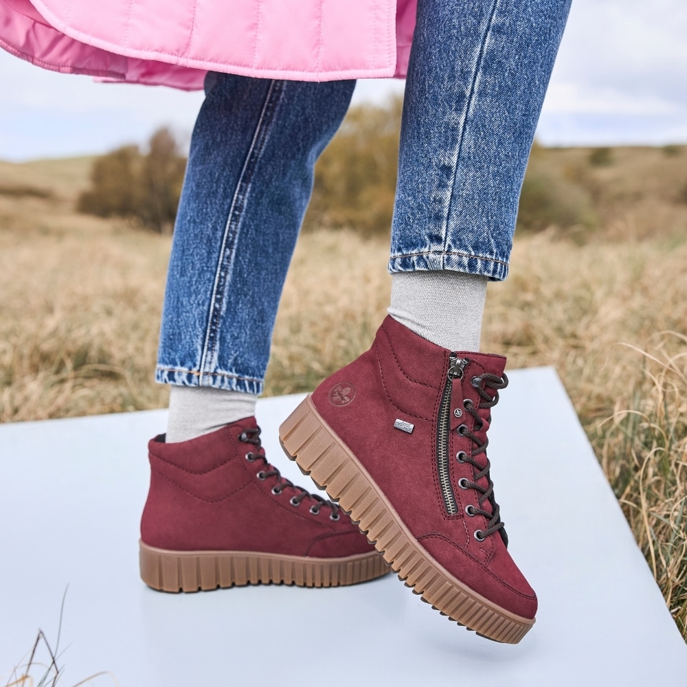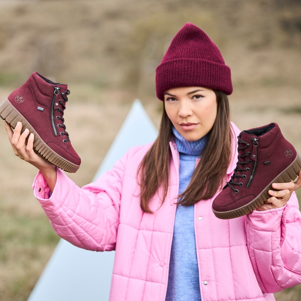 Rieker støvle til dame i bordeaux. Denne smarte støvle, forener stil og funktionalitet. Modellen har både snørebånd og en funktionel lynlås, der gør det nemt at tage støvlen af og på, mens den varme foring og den bløde udtagelige sål giver komfort dagen igennem. Takket være Rieker-Tex er støvlen kraftig vandafvisende, og den mønstrede ydersål øger både stødabsorbering og skridsikkerhed.
