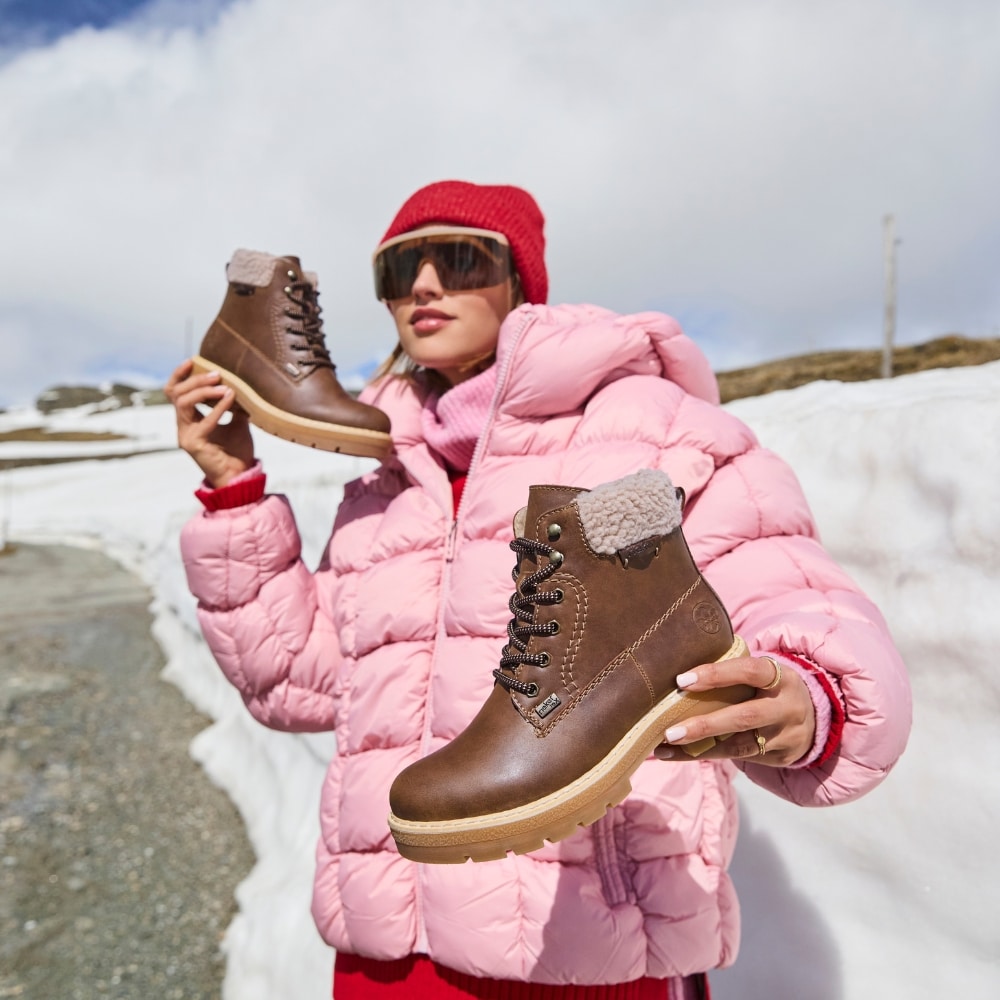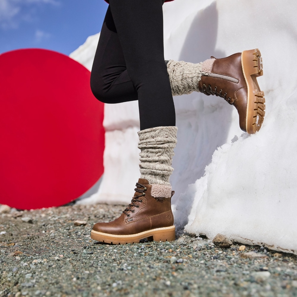 Rieker støvle til dame i brun. Stilfuld støvle med fokus på både komfort og funktion. Støvlen har snørebånd og en funktionel lynlås, som gør det nemt at tilpasse pasformen til foden. Indvendigt finder du en blød indersål og en varm foring, der giver komfort hele dagen. Rieker-Tex gør støvlen kraftig vandafvisende, mens den solide ydersål giver øget stødabsorbering og skridsikkerhed.