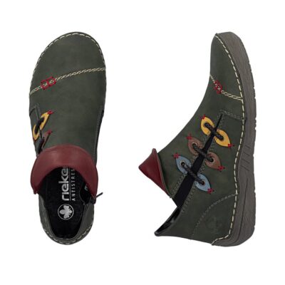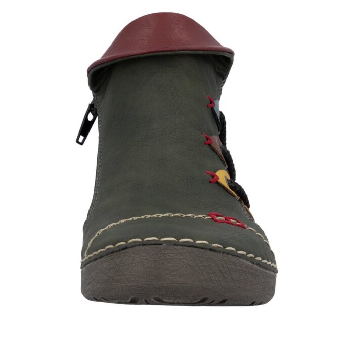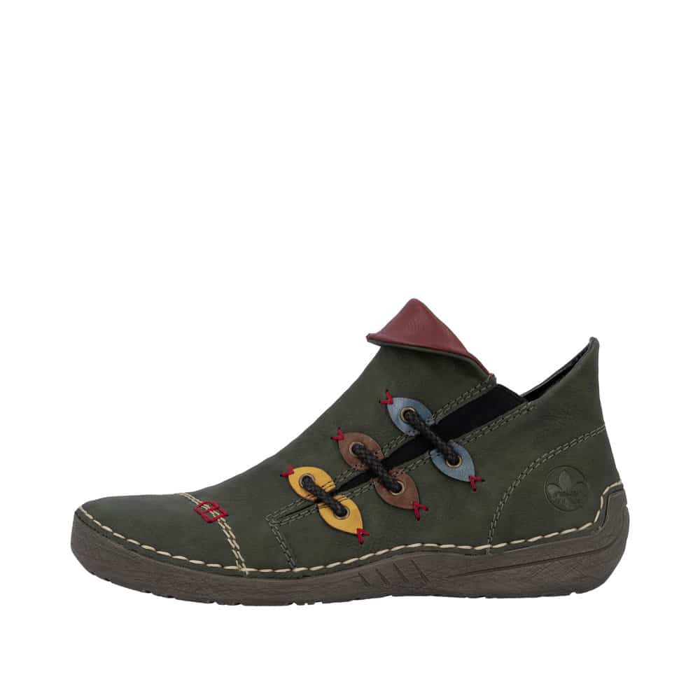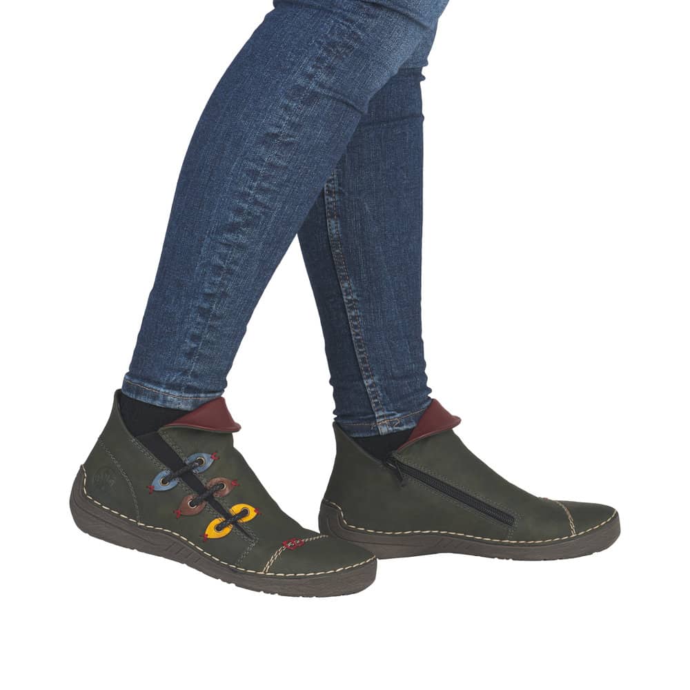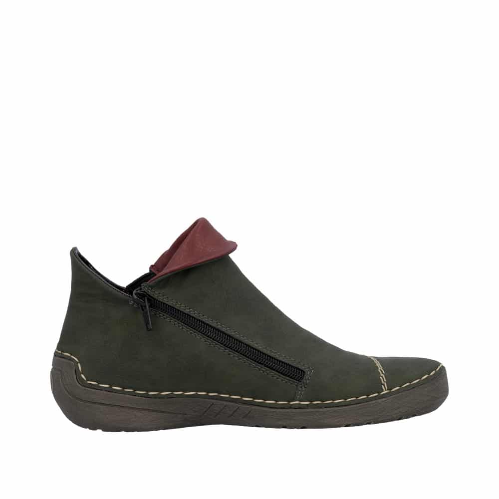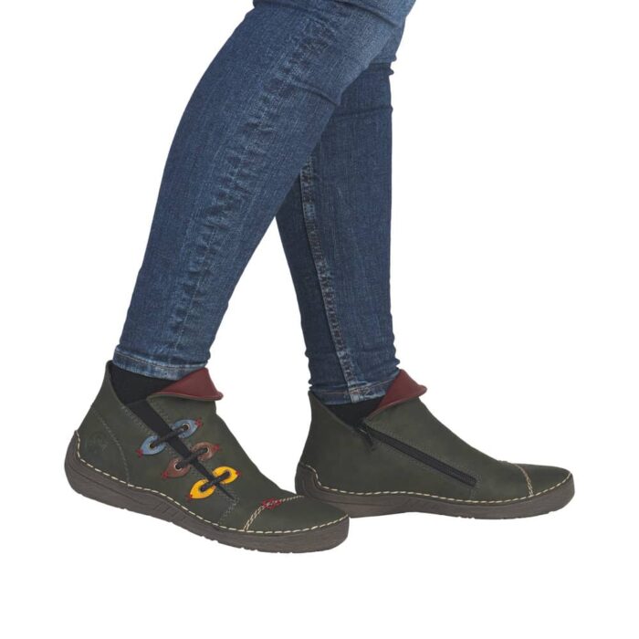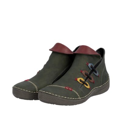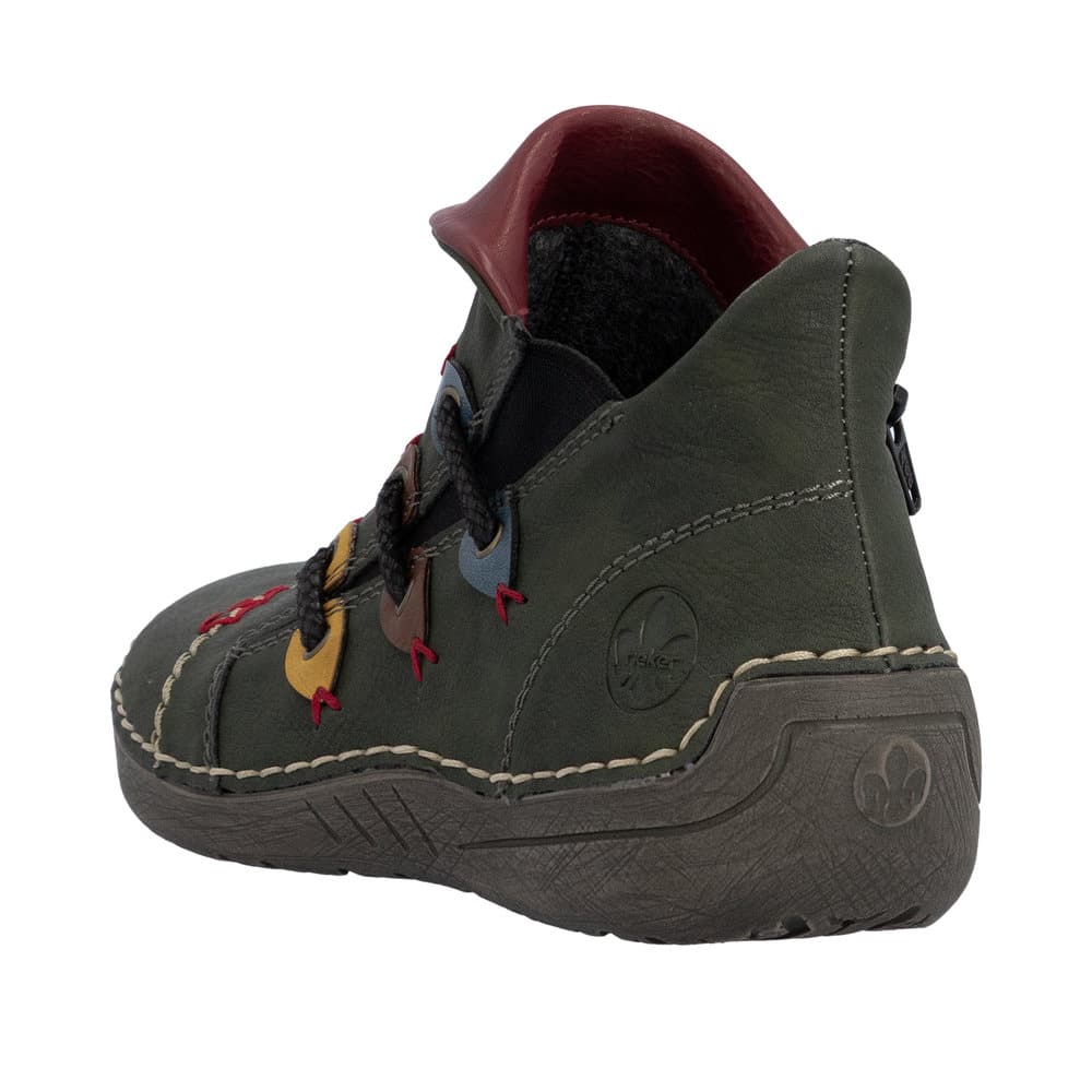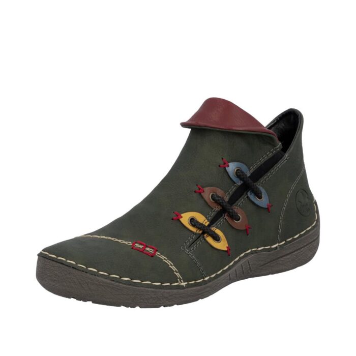 Rieker støvle til dame i grøn. Disse grønne støvler kombinerer funktionalitet med et frisk design. De farverige detaljer giver et moderne touch, mens lynlåsen på indersiden og elastikken på ydersiden gør dem lette at tage på. Den lette foring og den bløde indersål sørger for god komfort hele dagen. Ydersålen har et tydeligt mønster og stødabsorbering, som giver mere støtte og et sikkert greb.