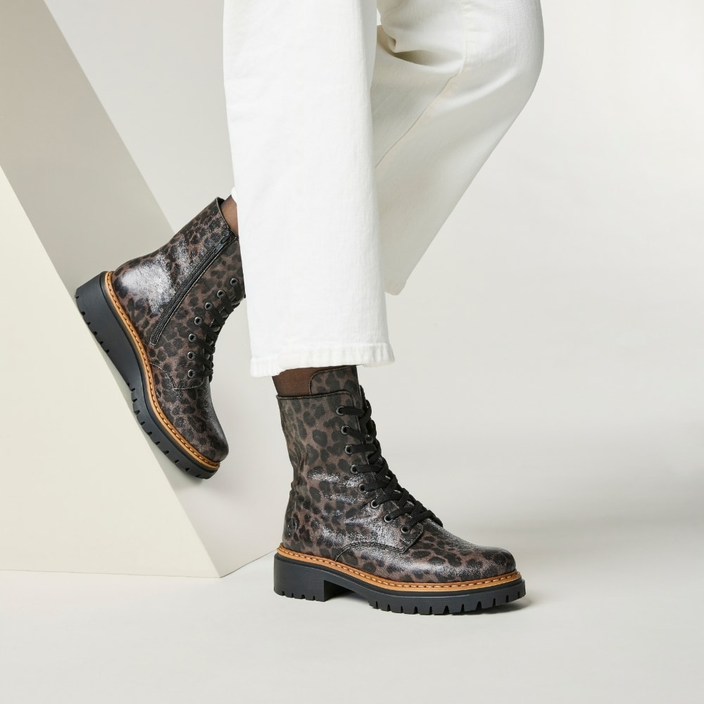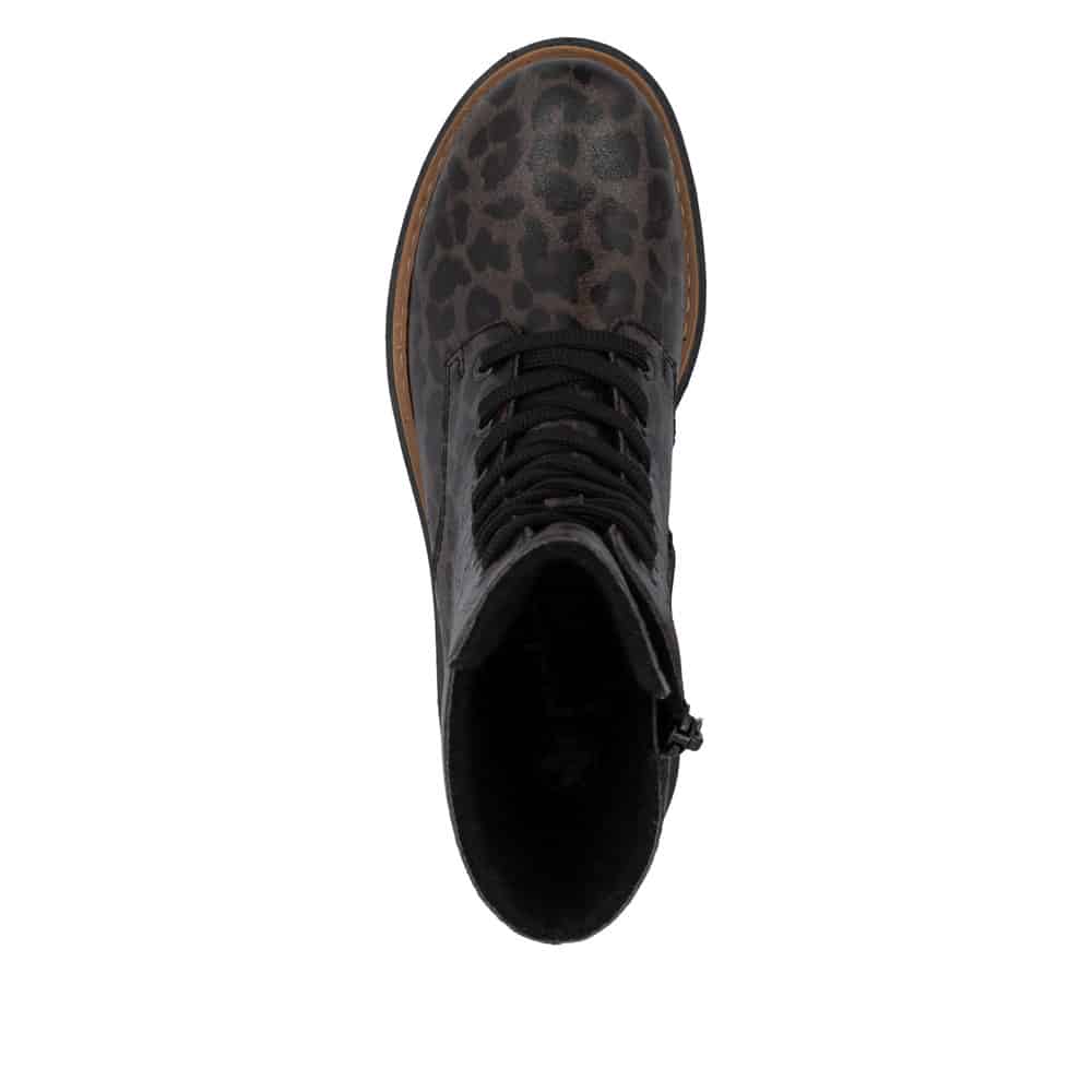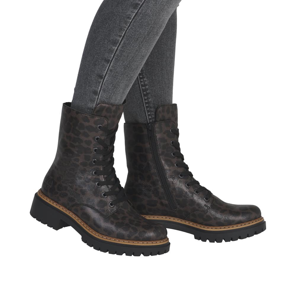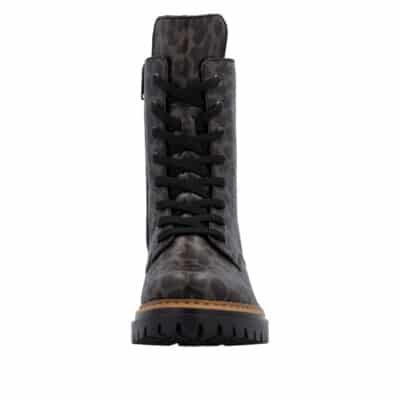 Rieker støvle til dame i leopard. Stilfuld og funktionel støvle til hverdagens gøremål. Den har både snørebånd og lynlås i siden, så du nemt kan justere pasformen efter behov. Indvendigt er støvlen udstyret med en blød sål og let foring for optimal komfort. Rieker Antistress gør at støvlen er let og fleksibel, og ydersålen med mønster giver øget skridsikkerhed og stødabsorbering.
