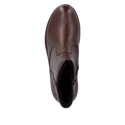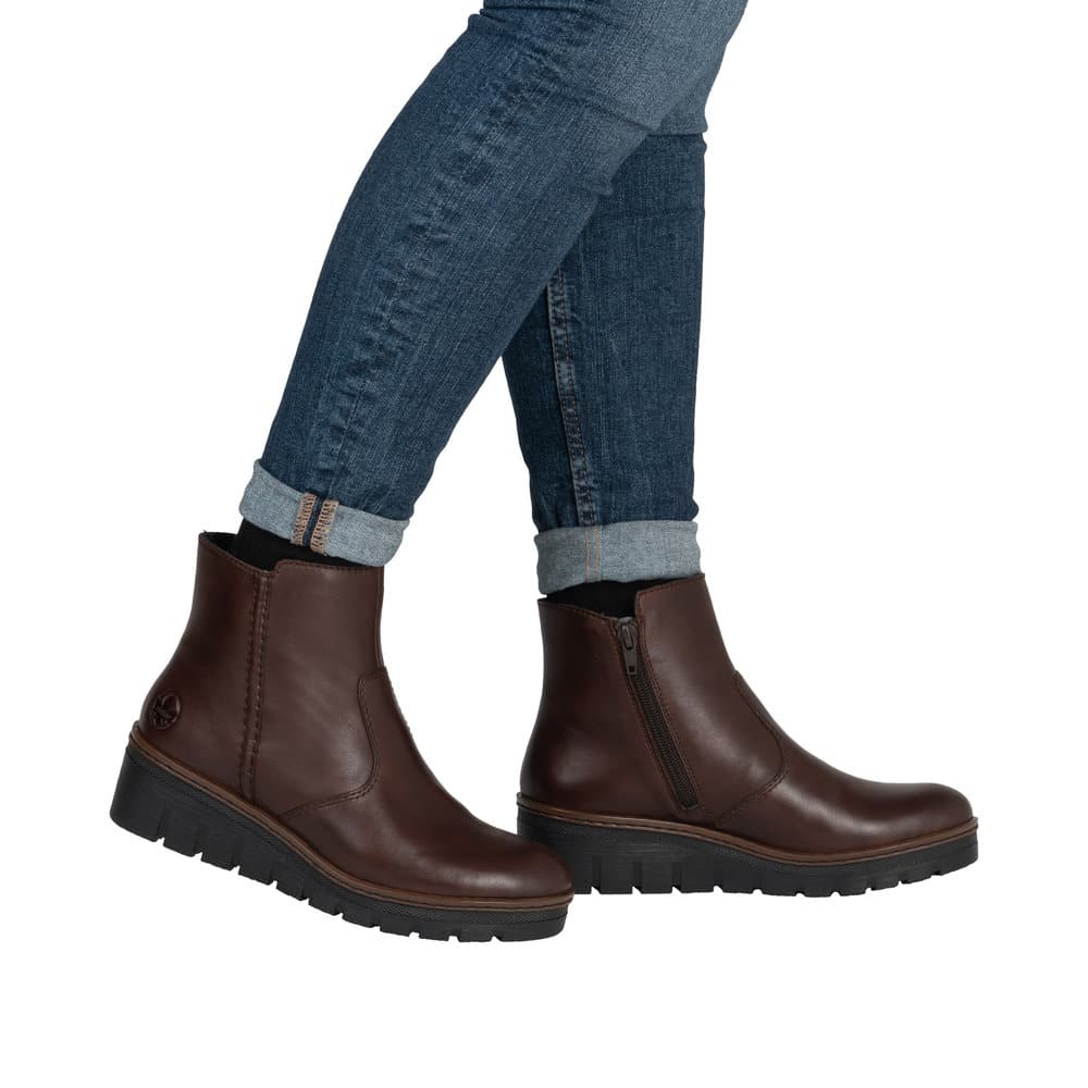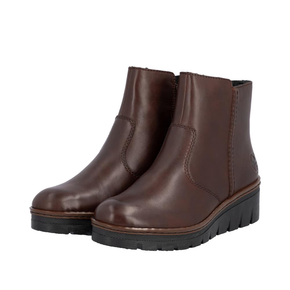 Rieker støvle til dame i mørkebrun. Stilfuld støvle med skindoverdel, der passer perfekt til både hverdag og pænere brug. Støvlen har en funktionel lynlås, som gør det nemt at tage den af og på. Indvendigt er støvlen udstyret med varm foring og en blød indersål, der giver god komfort hele dagen. Den chunky ydersål på 4,5 cm giver et elegant løft, mens mønsteret sikrer øget støtte og skridsikkerhed i hvert skridt.