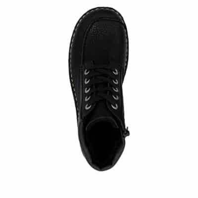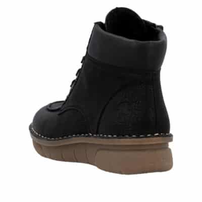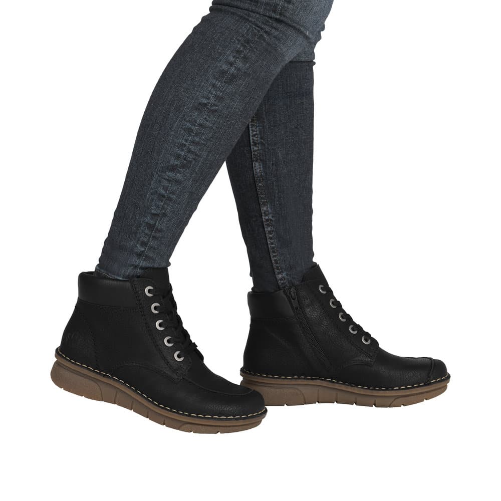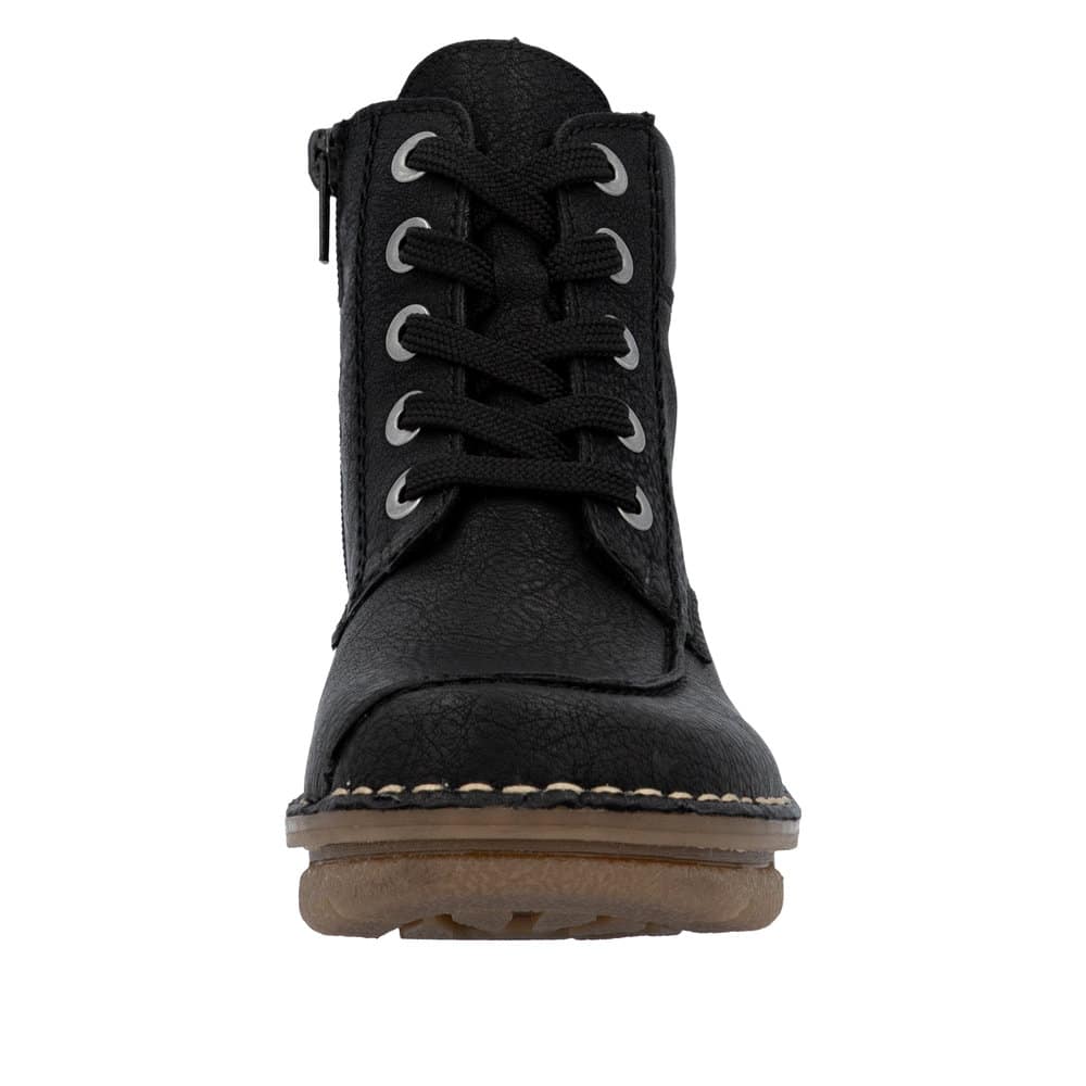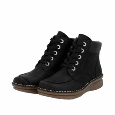 Rieker støvle til dame i sort. Denne støvle er skabt til dig, der ønsker komfort uden at gå på kompromis med stilen. Snørebåndene og den funktionelle lynlås gør den nem at tage på, mens den varme foring og den bløde udtagelige sål giver fødderne en god komfort. Ydersålen er designet med mønster, der giver både øget stødabsorbering og skridsikkerhed på forskellige underlag.