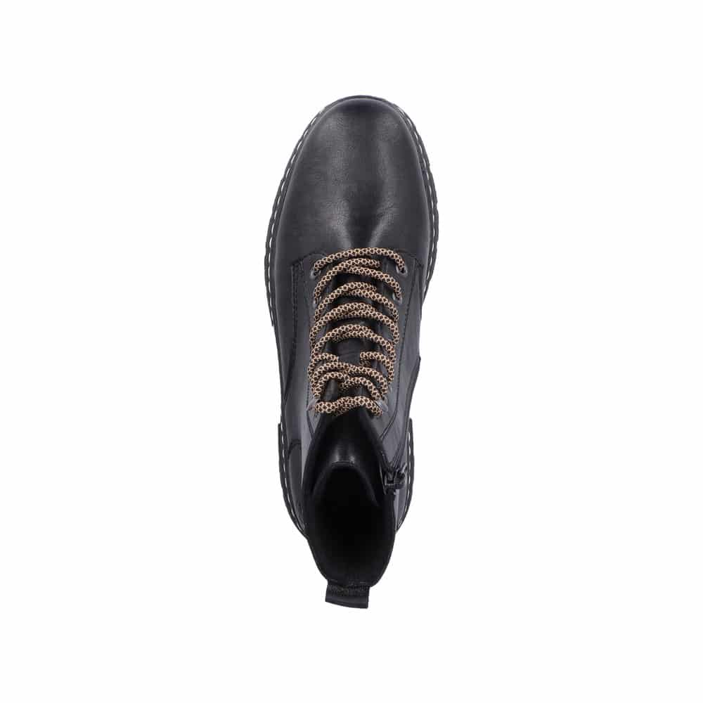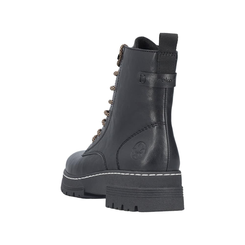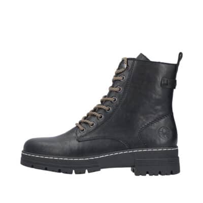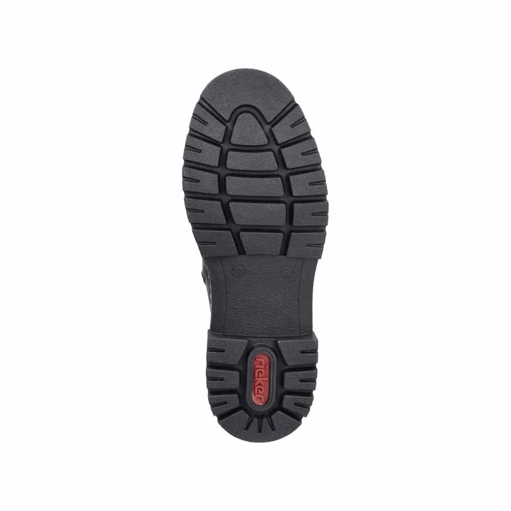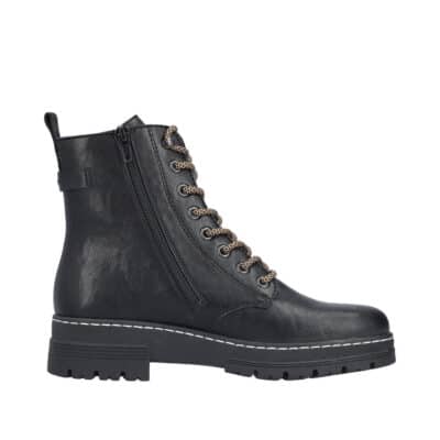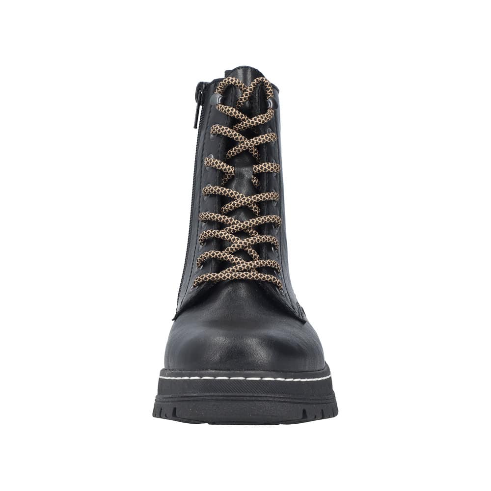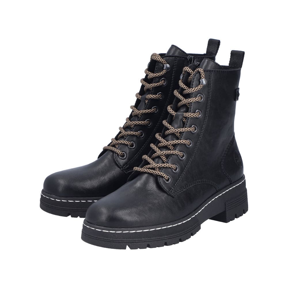 Rieker støvle til dame i sort. Denne sorte støvle kombinerer et moderne udtryk med komfort til hverdagen. Støvlen har snørebånd og en funktionel lynlås, som gør det nemt at komme i og af. Indvendigt finder du en blød og udtagelig sål samt en let foring, der giver en behagelig fornemmelse hele dagen. Den chunky ydersål med en blokhæl på 2 cm giver et let løft, mens det mønstrede ydersål giver øget stødabsorbering og skridsikkerhed.