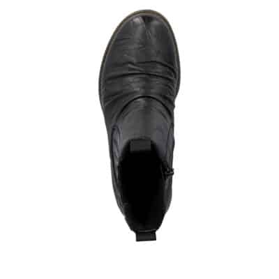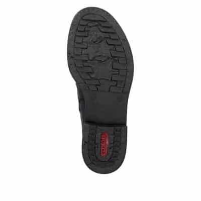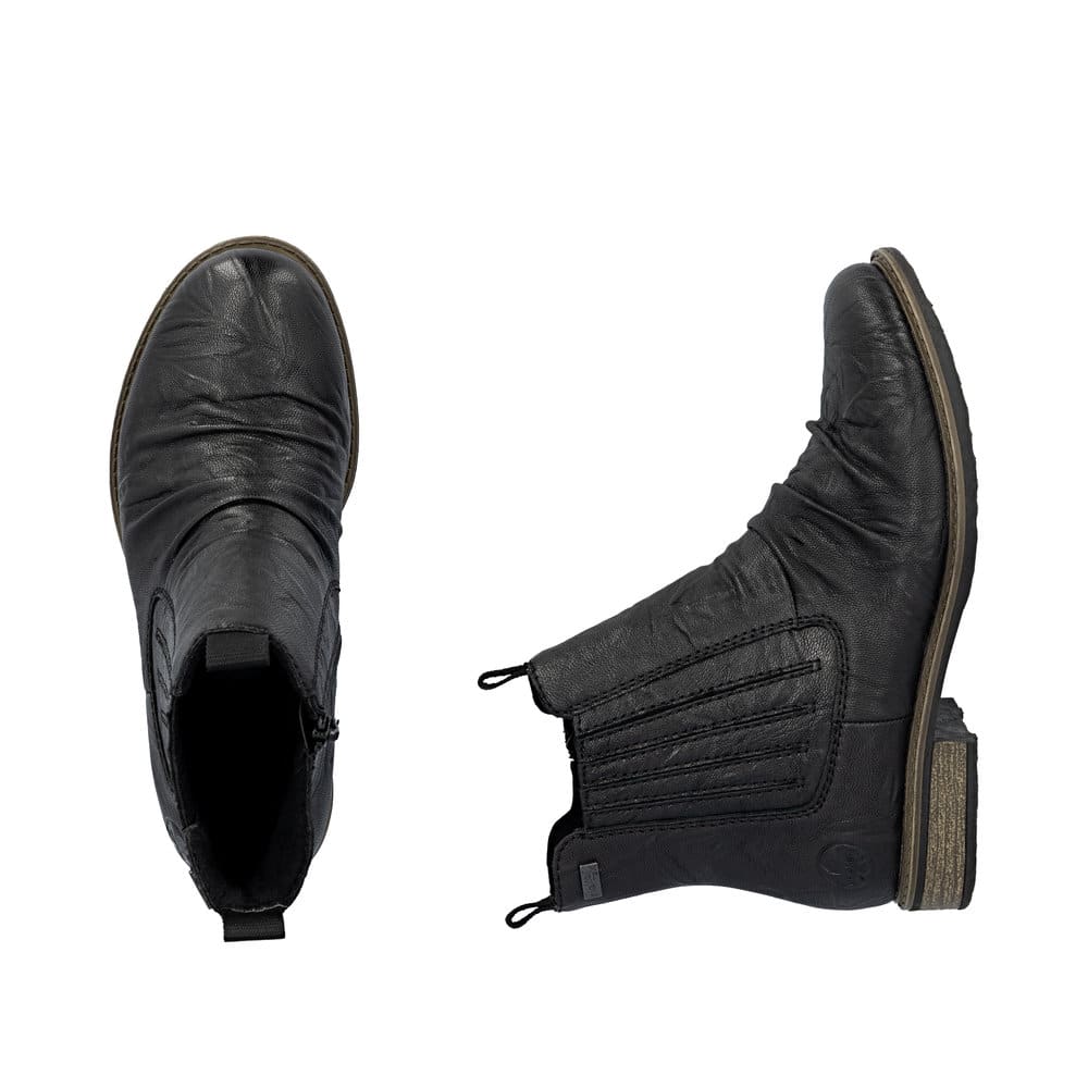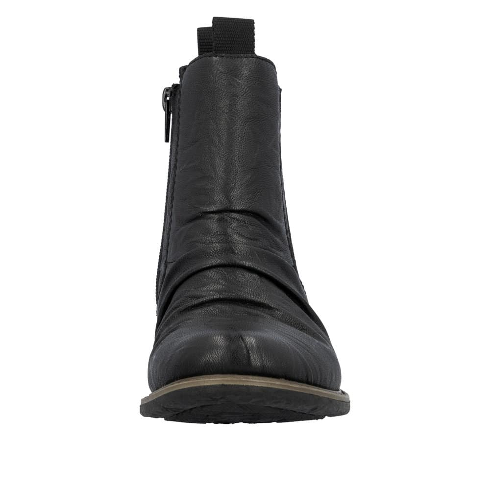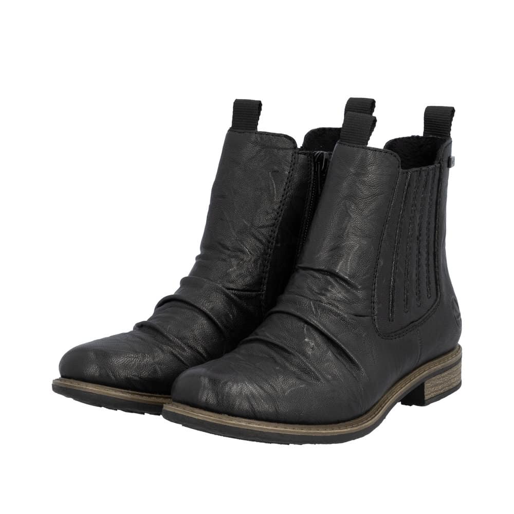 Rieker støvle til dame i sort. Denne sorte støvle kombinerer et klassisk design med praktiske detaljer og høj komfort. Rynkede detaljer giver et feminint udtryk, og overdelen i skind understreger kvaliteten. Modellen har elastik på ydersiden og lynlås på indersiden, hvilket gør den nem at tage af og på. Indvendigt finder du en let foring og en blød, udtagelig indersål med ekstra bredde H for en rummelig pasform. Takket være Rieker Tex er støvlen kraftigt vandafvisende. Den lille hæl på 2,5 cm giver et diskret løft, mens ydersålen med stødabsorbering og mønster sikrer komfort, stabilitet og skridsikkerhed.