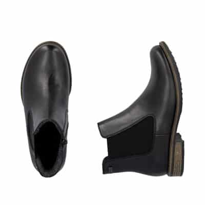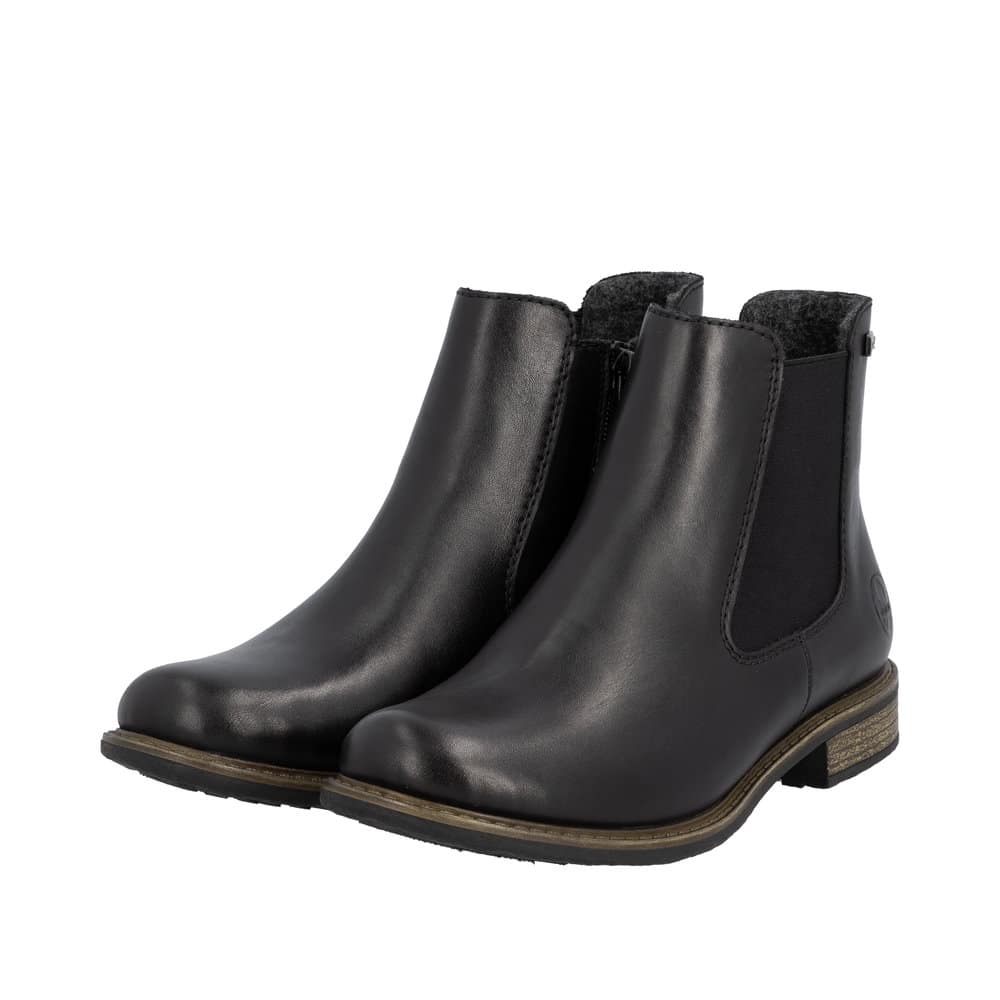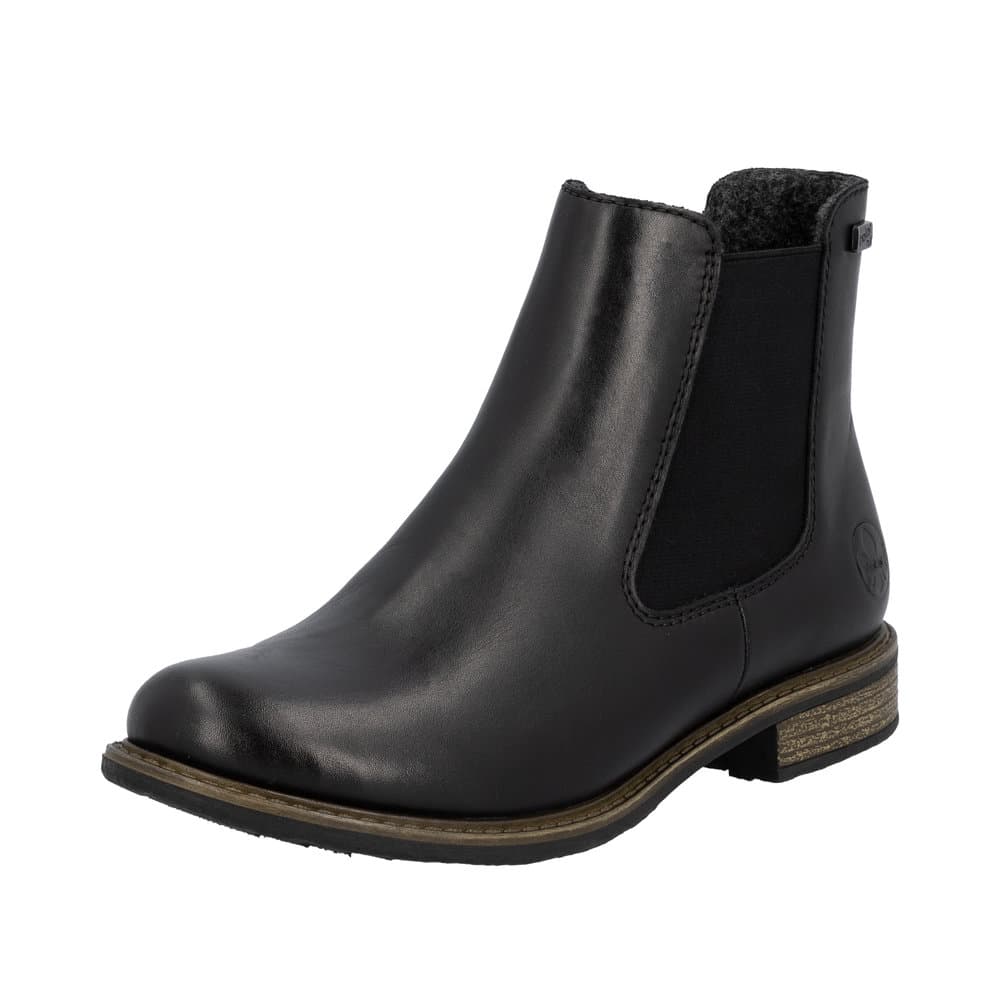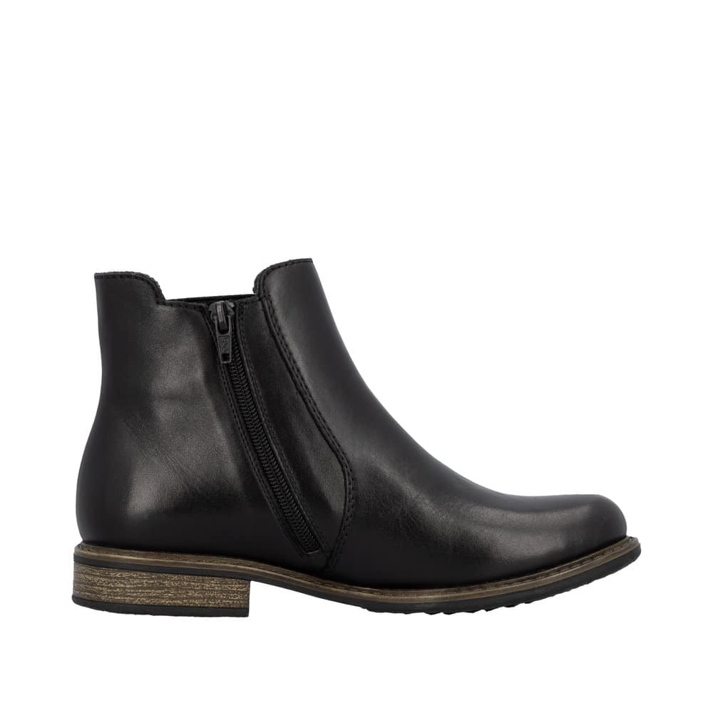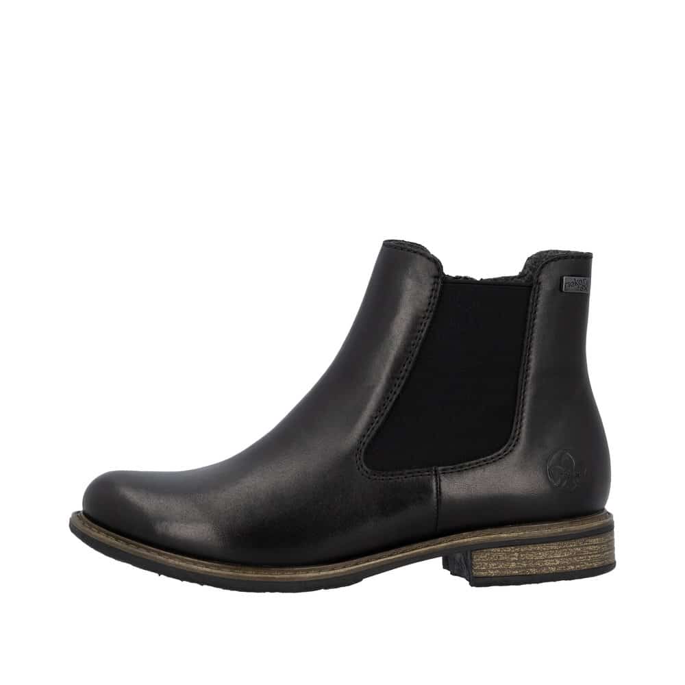 Rieker støvle til dame i sort. Klassisk sort ankelstøvle i skind med et tidløst design og praktiske funktioner. Støvlen har elastik på ydersiden, som giver en behagelig og fleksibel pasform, mens lynlåsen på indersiden gør den nem at tage af og på. Indvendigt sørger en blød og udtagelig indersål samt en let foring for optimal komfort dagen igennem. Støvlen er udstyret med Rieker-Tex, der gør den kraftigt vandafvisende, og med ekstra bredde H får du en rummelig pasform. Ydersålen er solid og mønstret, hvilket giver stødabsorbering og ekstra komfort.