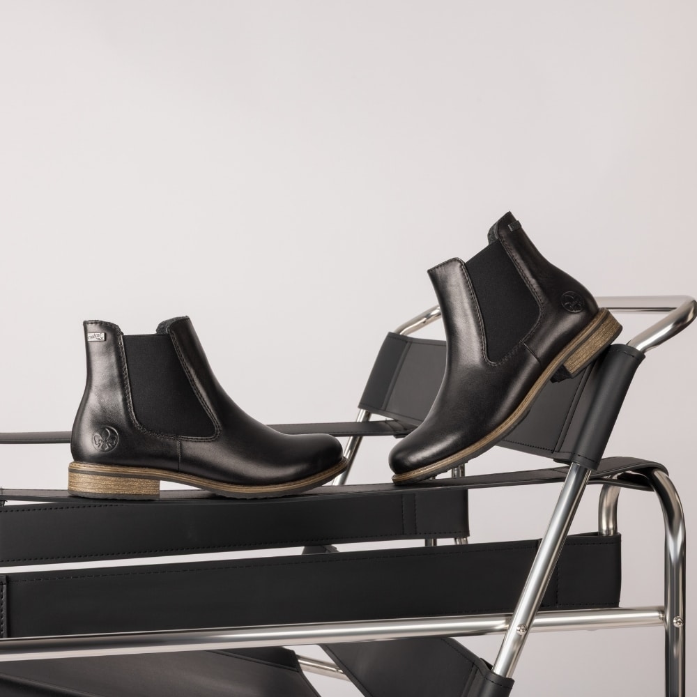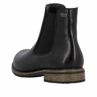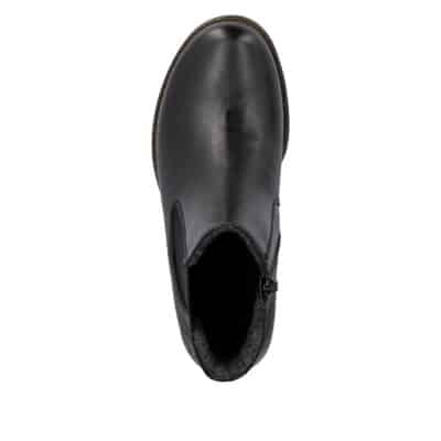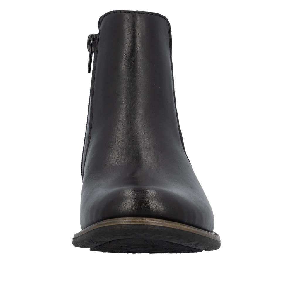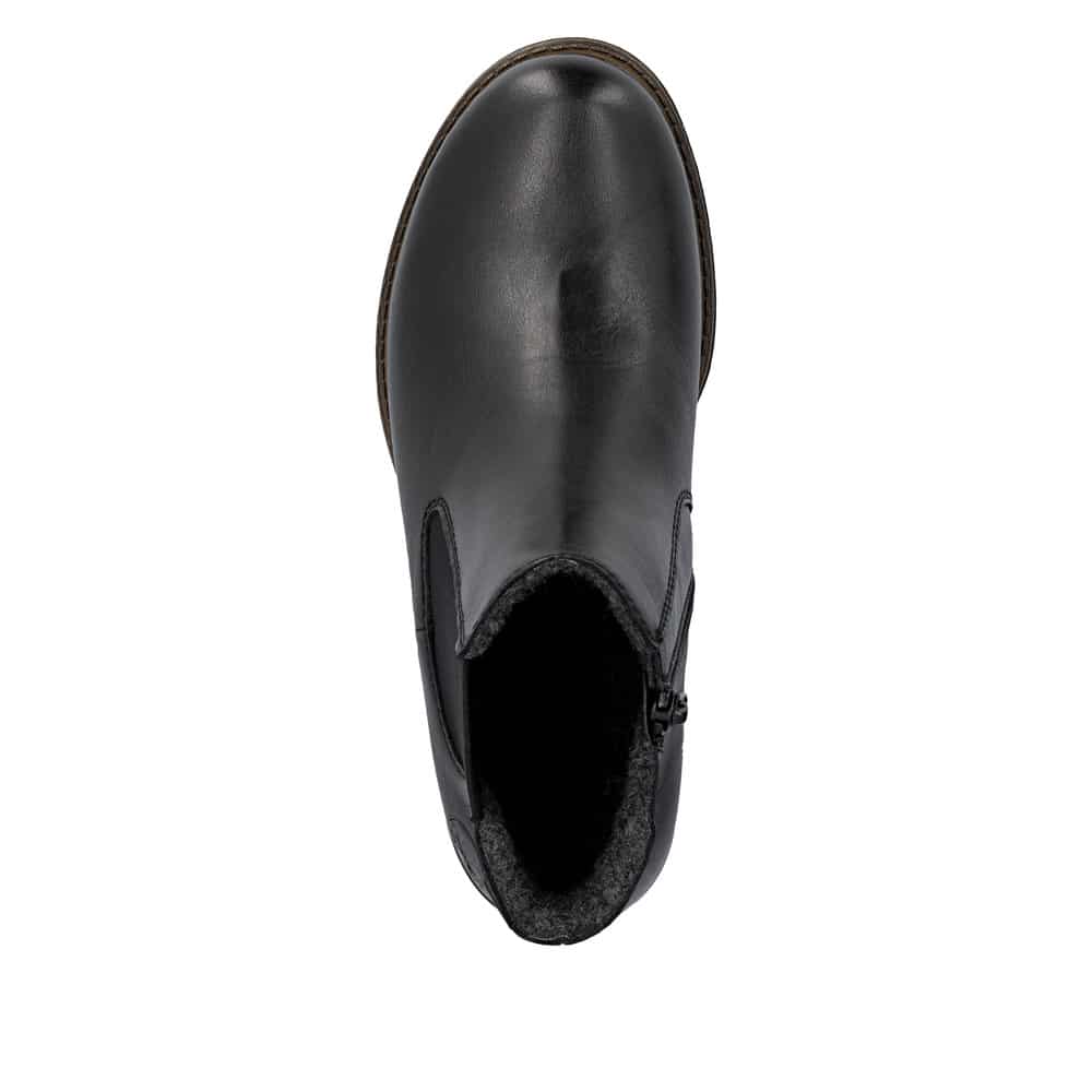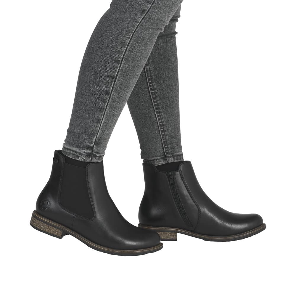 Rieker støvle til dame i sort. Klassisk sort ankelstøvle i skind med et tidløst design og praktiske funktioner. Støvlen har elastik på ydersiden, som giver en behagelig og fleksibel pasform, mens lynlåsen på indersiden gør den nem at tage af og på. Indvendigt sørger en blød og udtagelig indersål samt en let foring for optimal komfort dagen igennem. Støvlen er udstyret med Rieker-Tex, der gør den kraftigt vandafvisende, og med ekstra bredde H får du en rummelig pasform. Ydersålen er solid og mønstret, hvilket giver stødabsorbering og ekstra komfort.