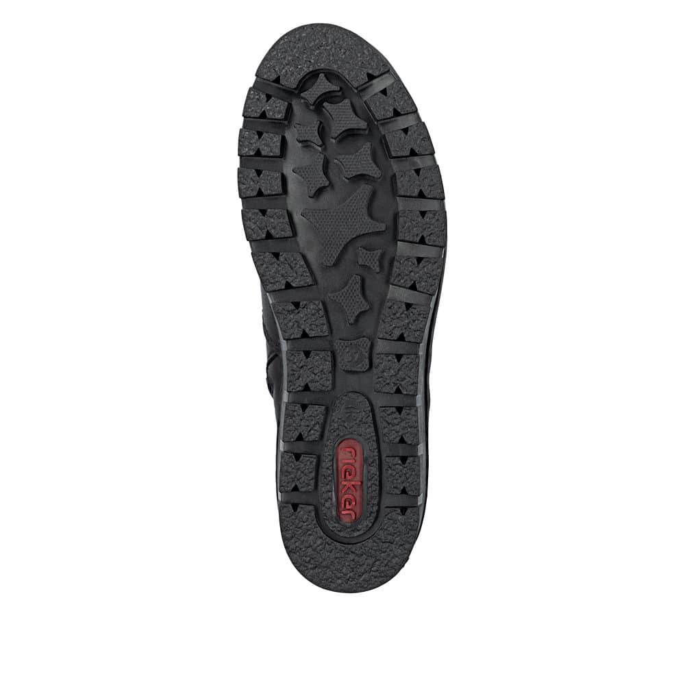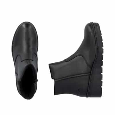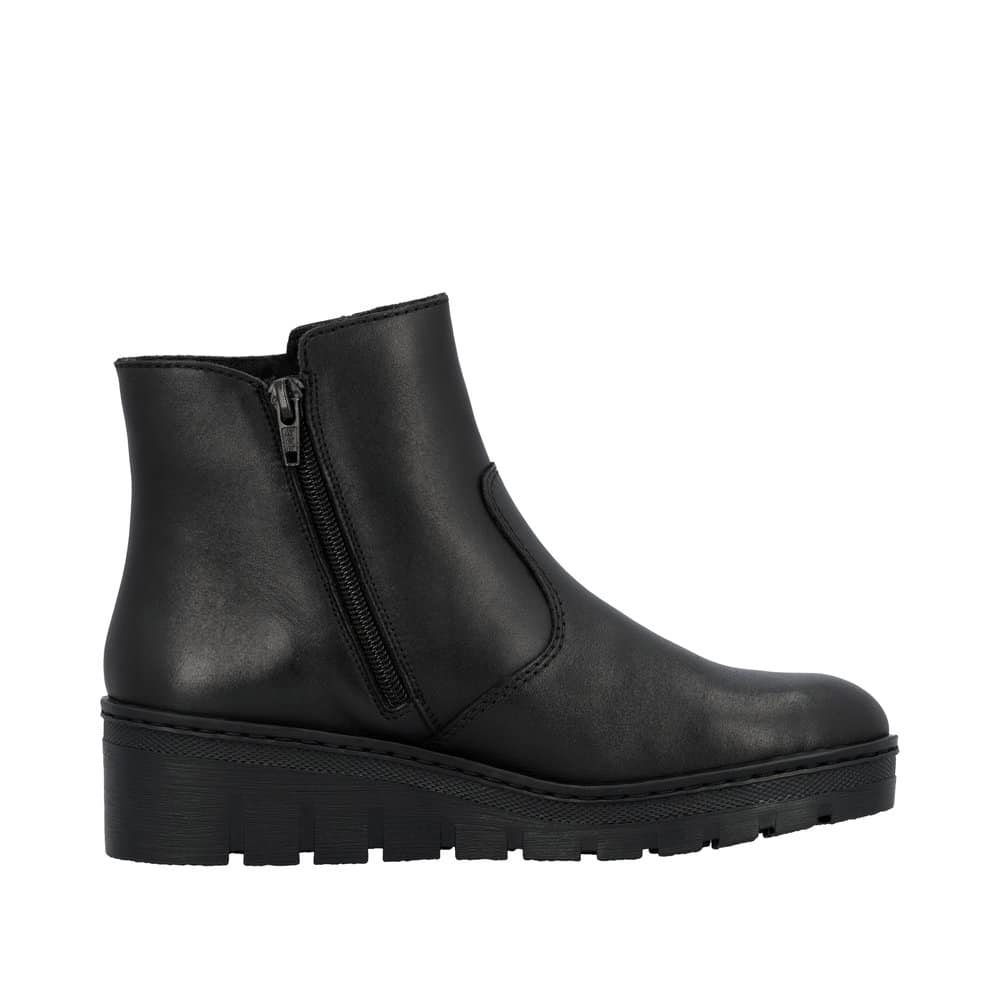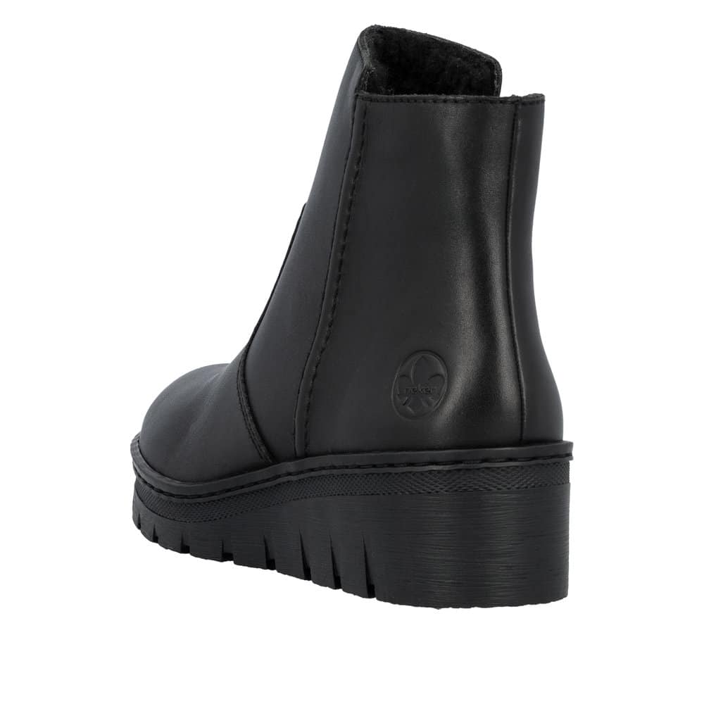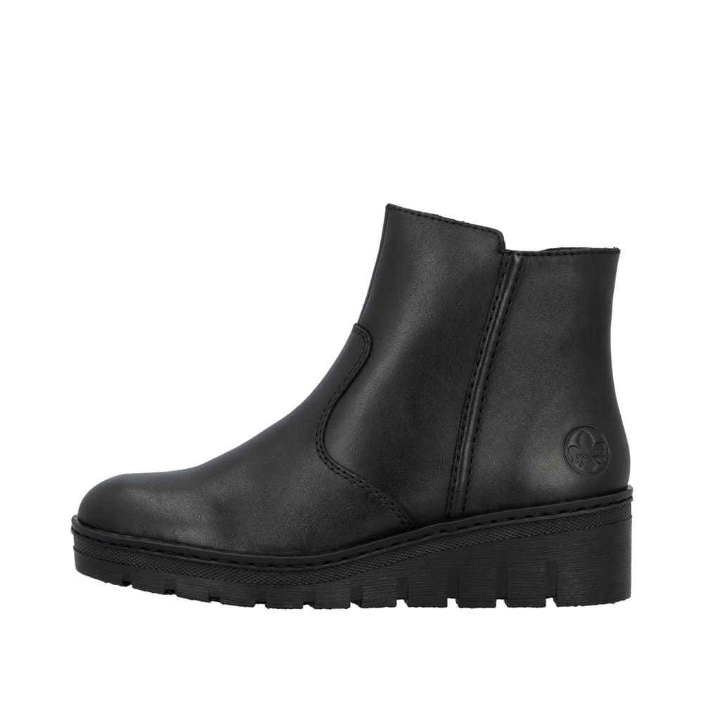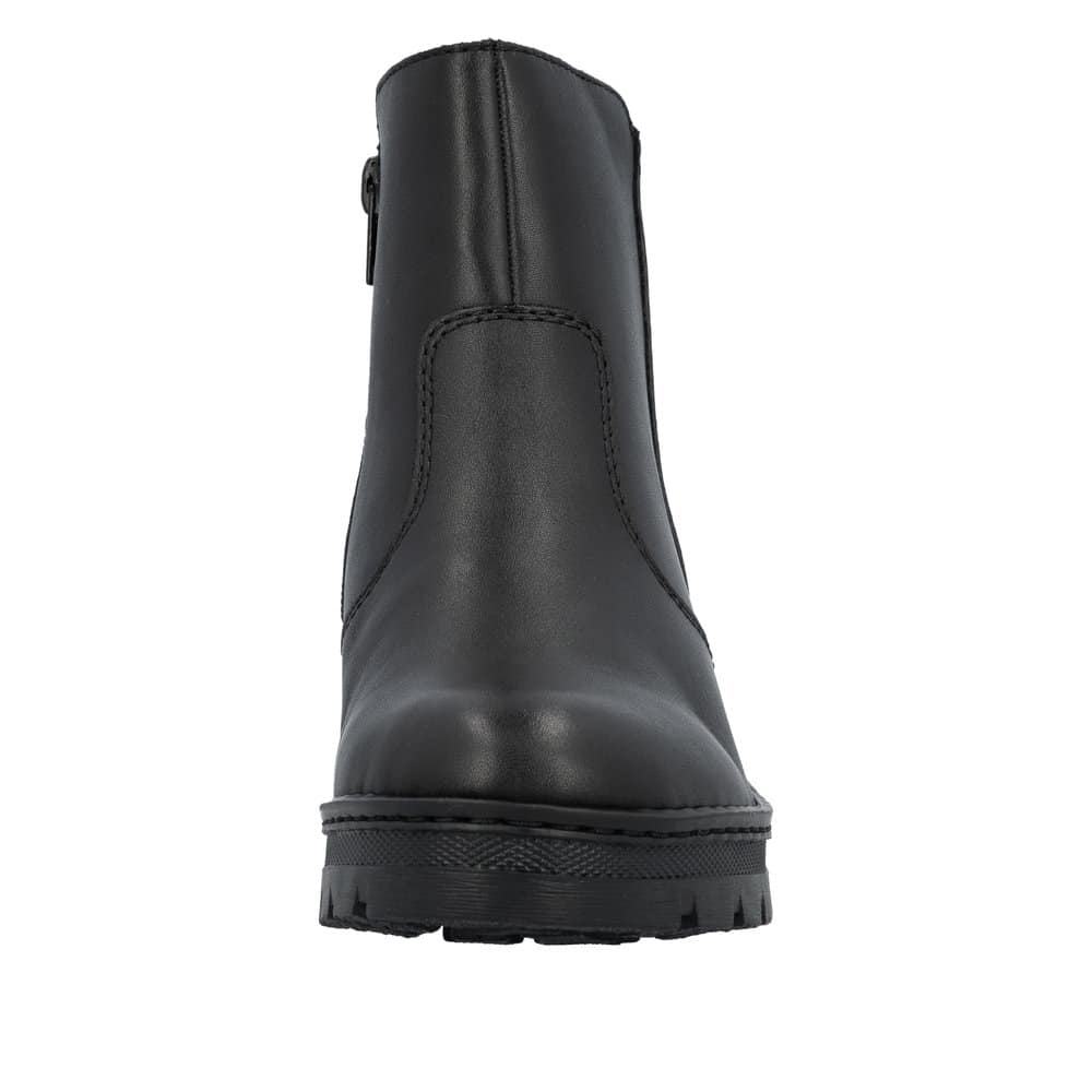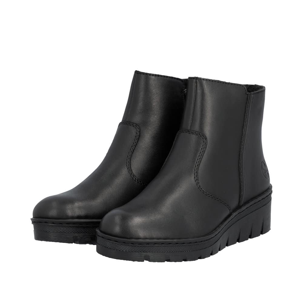 Rieker støvle til dame i sort. Elegant støvle med skindoverdel, der passer perfekt til både hverdag og pænere brug. Støvlen har en funktionel lynlås, som gør det nemt at komme i og af. Indvendigt er støvlen udstyret med en blød sål og varm foring, der giver god komfort hele dagen. Den mønstrede ydersål med kilehæl på 4,5 cm giver et flot løft og giver øget stødabsorbering og skridsikkerhed i hverdagen.
