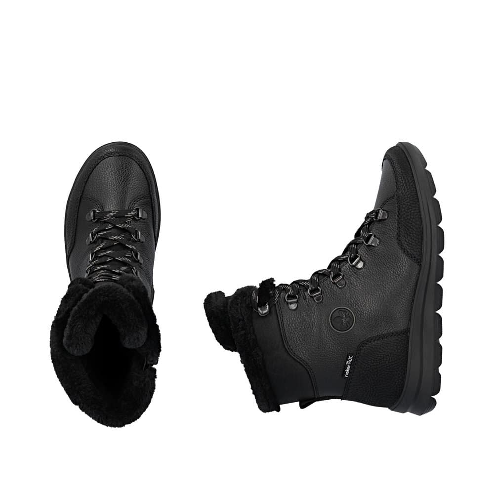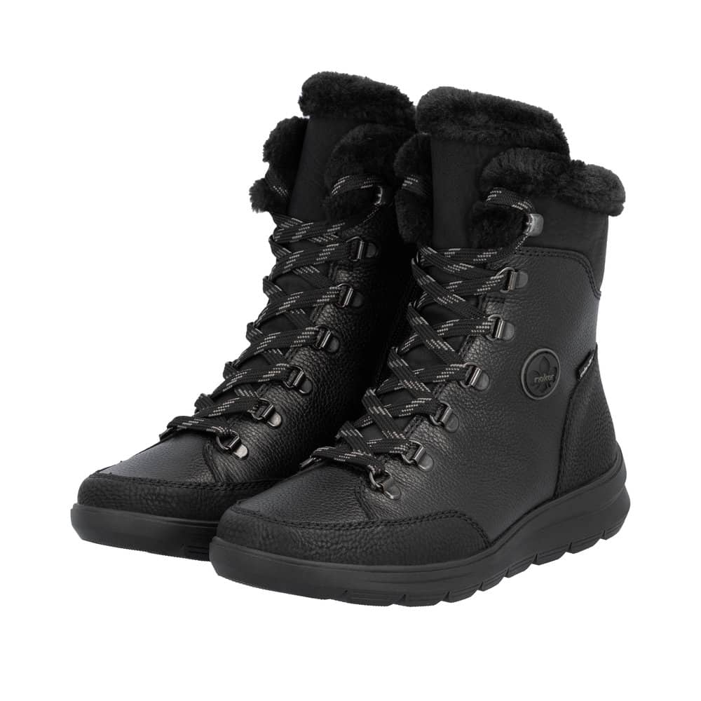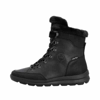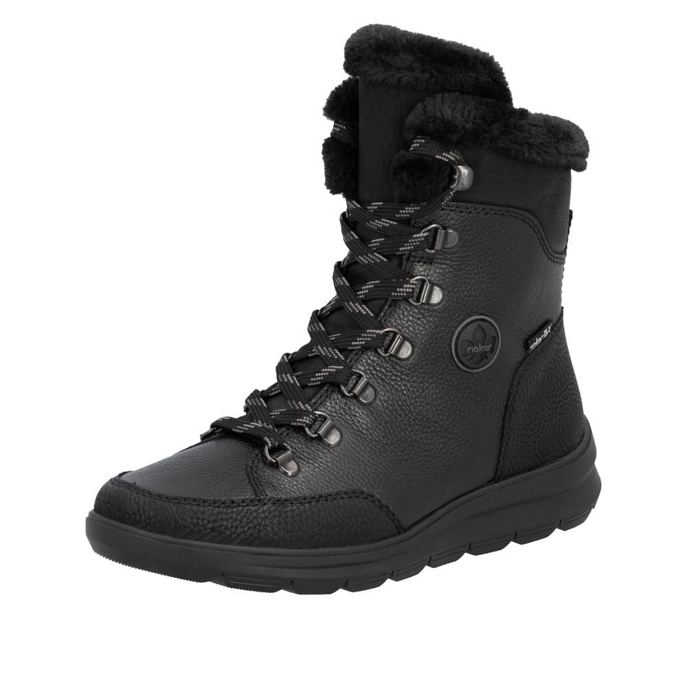 Rieker støvle til dame i sort. Praktisk og moderne vinterstøvle i skind, designet til at give både komfort og funktionalitet i hverdagen. Med kombinationen af snørebånd og lynlås er støvlen nem at få af og på, samtidig med at pasformen let kan justeres. Indvendigt har støvlen en varm foring og en blød udtagelig indersål, der gør støvlen behagelig at have på hele dagen. Rieker-Tex gør støvlen kraftig vandafvisende, mens den mønstrede ydersål giver øget stødabsorbering og skridsikkerhed.