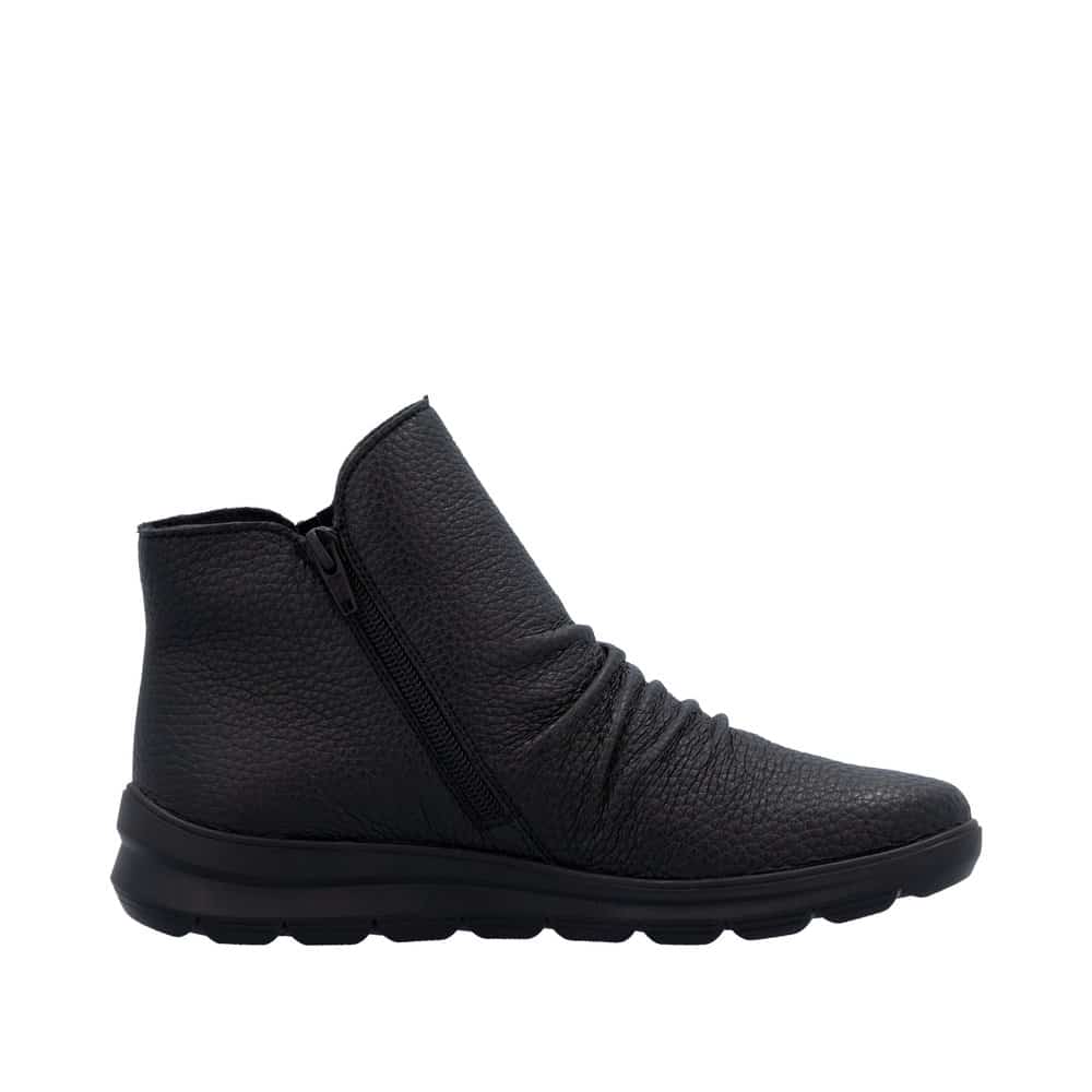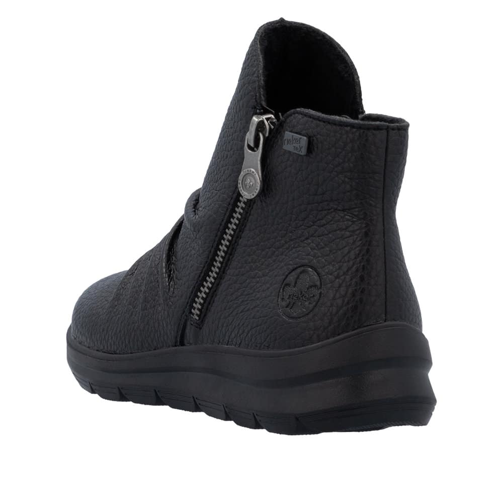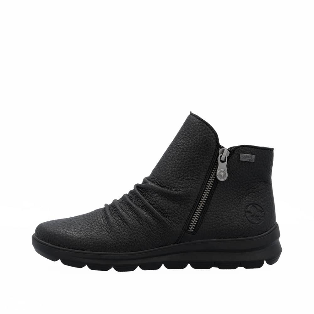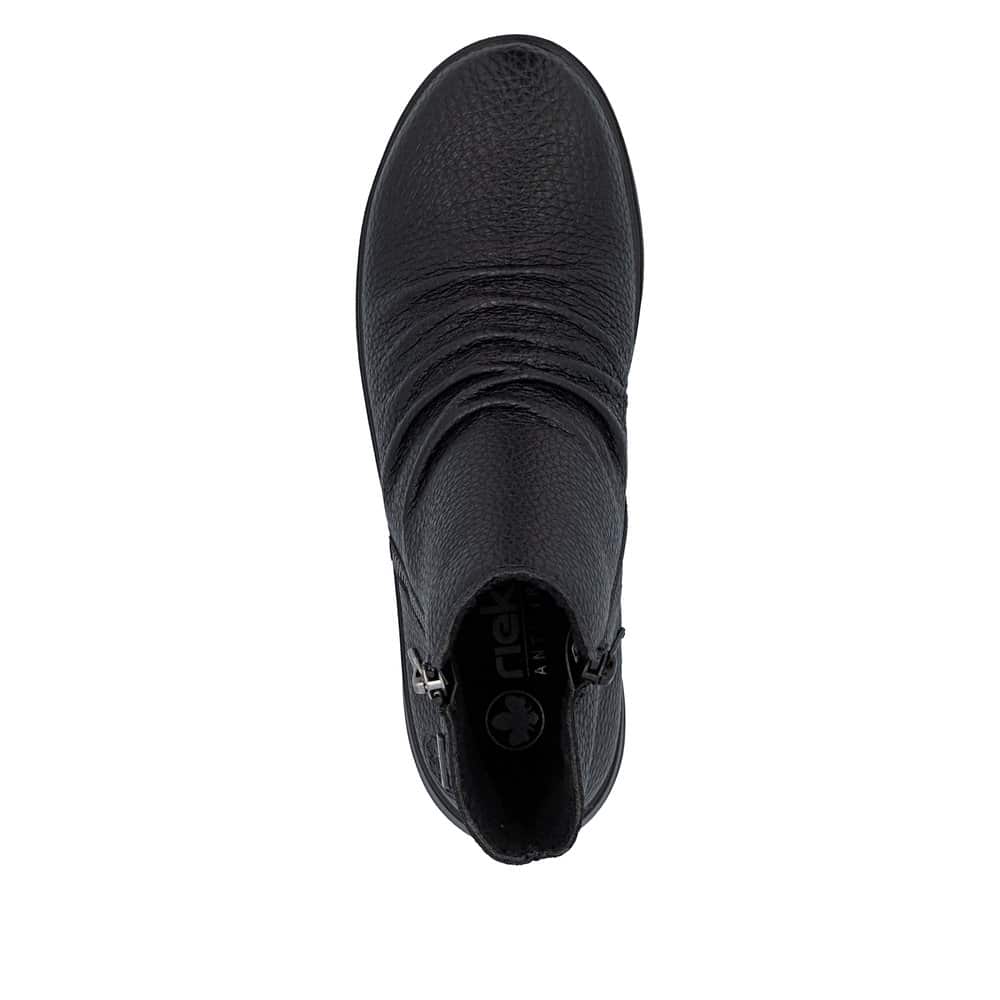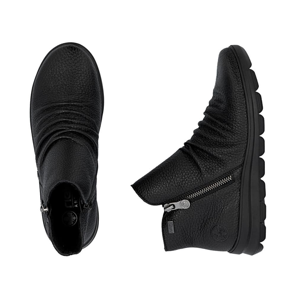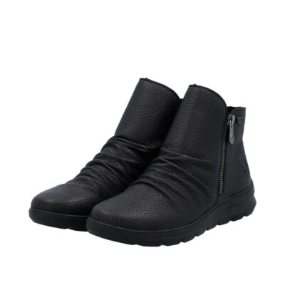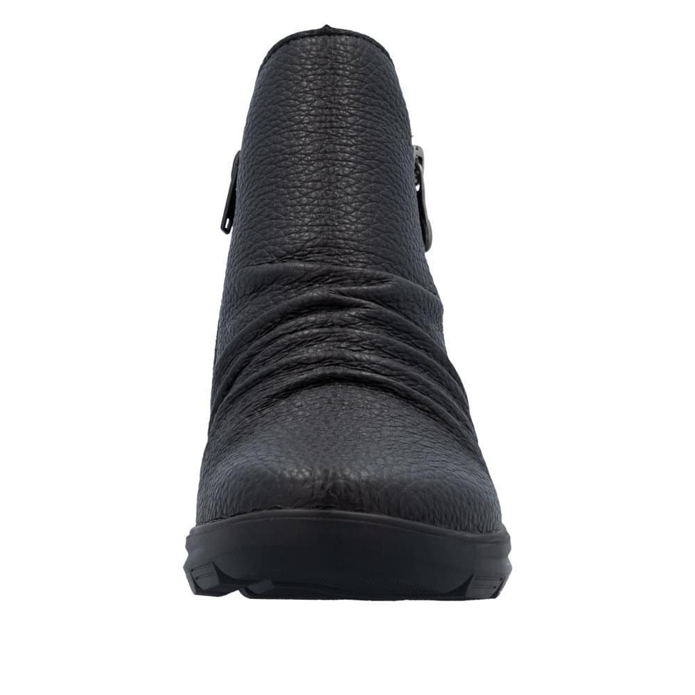 Rieker støvle til dame i sort. En elegant støvle i sort med skindoverdel og lynlåse i begge sider, så du nemt kan tage den af og på. Den rynkede detalje foran giver et stilrent og moderne look. Indvendigt sørger en blød, udtagelig Rieker-soft sål og en let foring for behagelig komfort hele dagen. Takket være Rieker-Tex er støvlen kraftigt vandafvisende, og den mønstrede ydersål giver både øget stødabsorbering og skridsikkerhed.