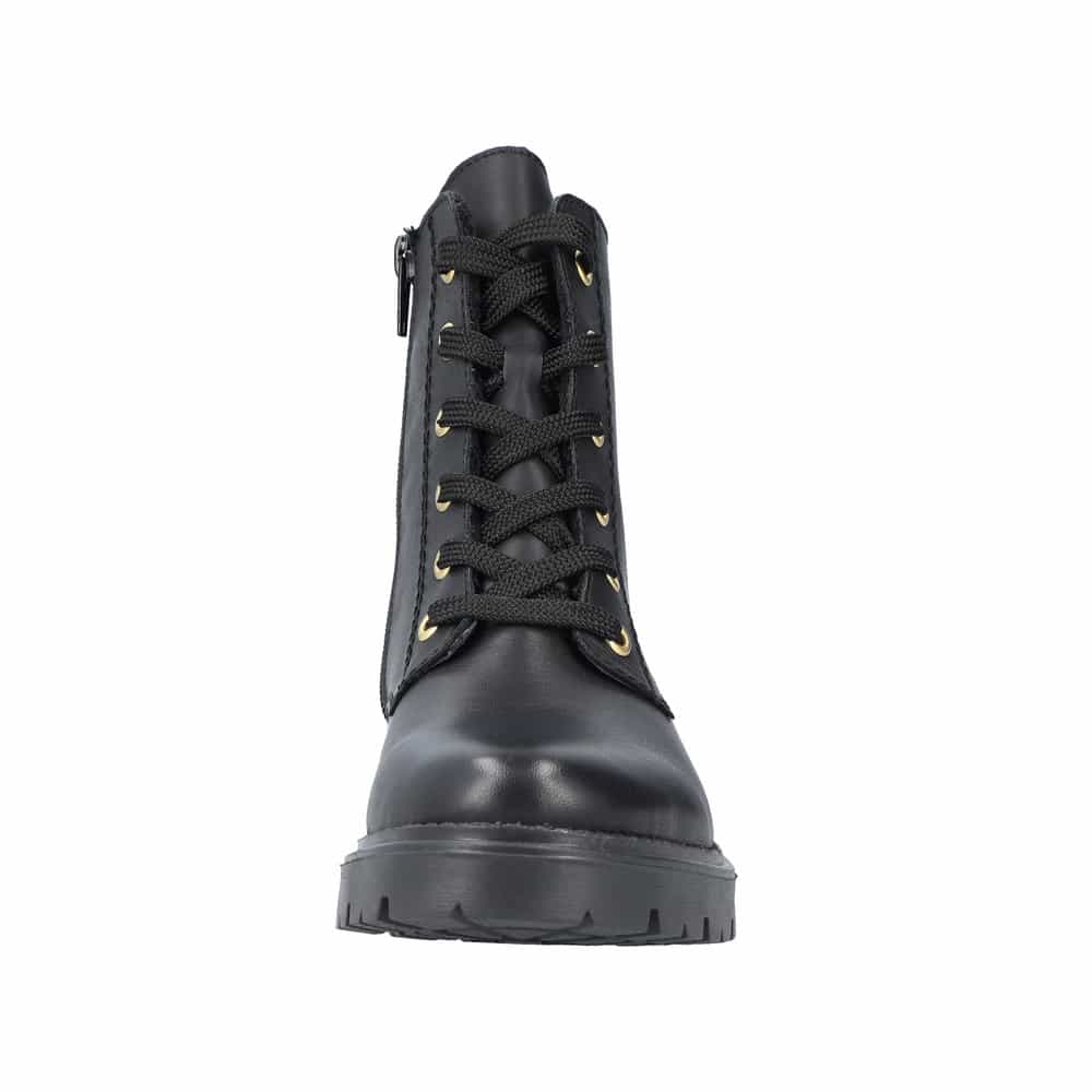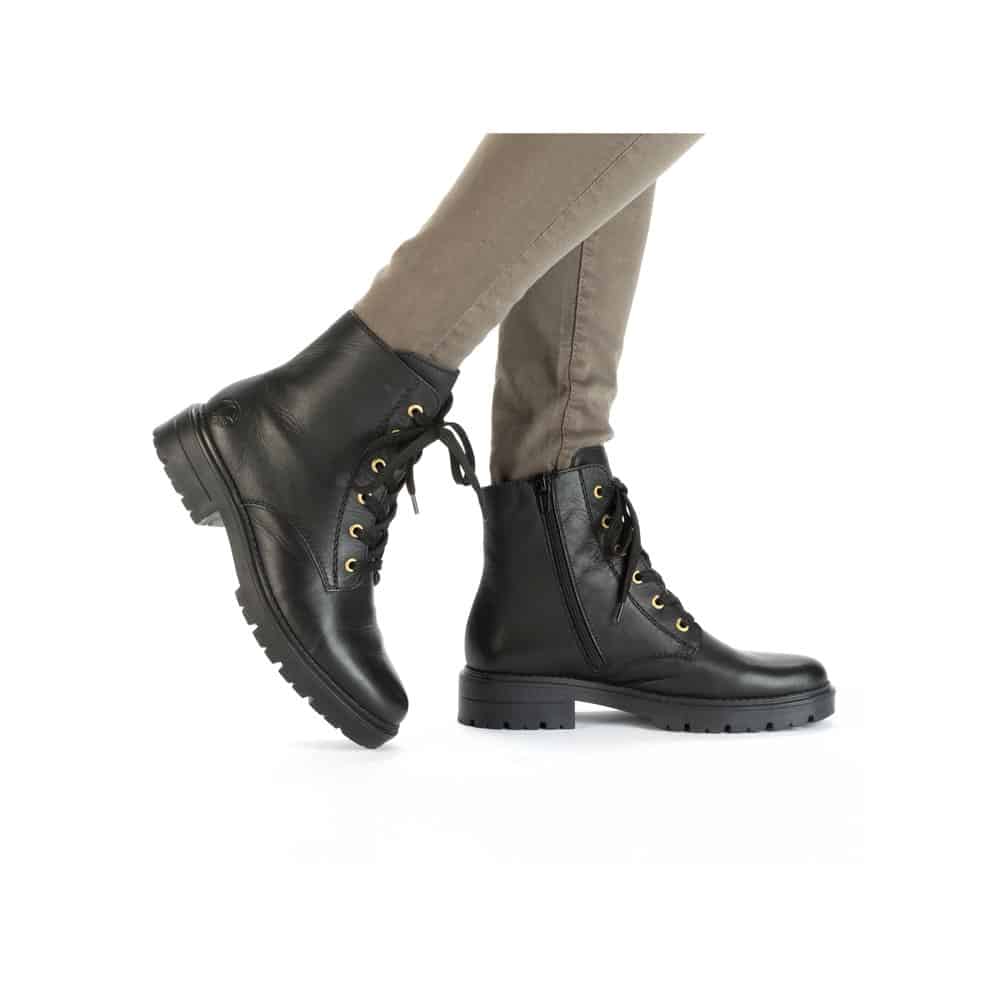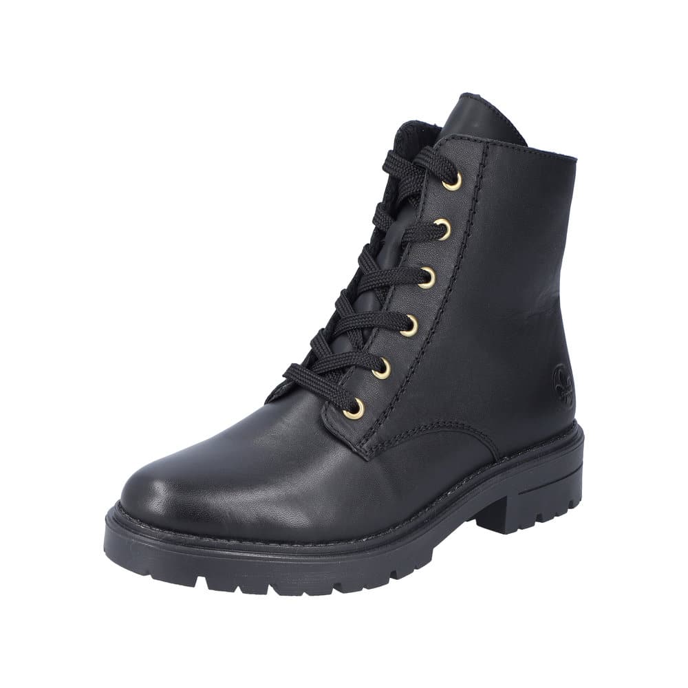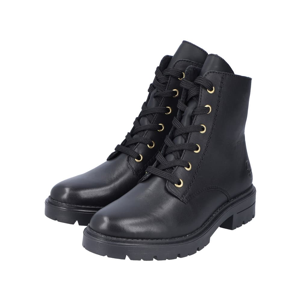 Rieker støvle til dame i sort. Smart støvle med flot design og funktionelle detaljer. Snørebånd og lynlås gør den nem at tage på og giver mulighed for en tilpasset pasform. Indvendigt mødes du af en let foring og en blød sål, som giver god komfort hele dagen. Den mønstrede ydersål øger både stødabsorbering og skridsikkerhed.