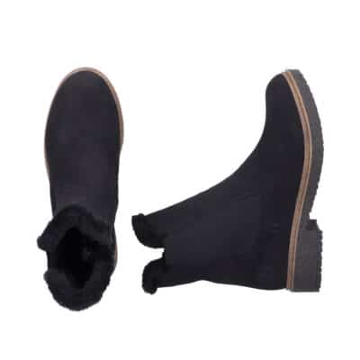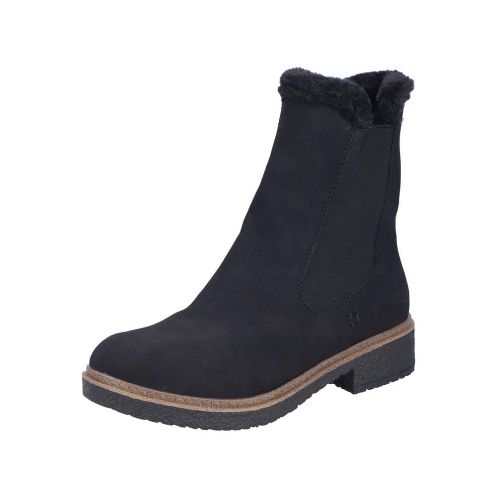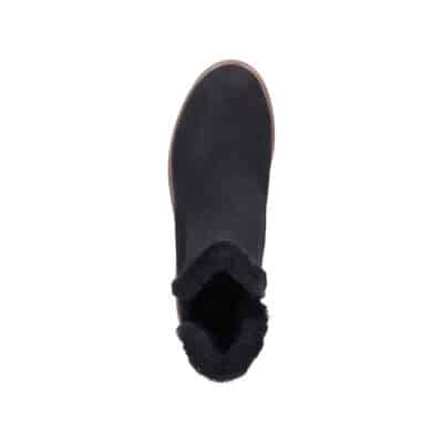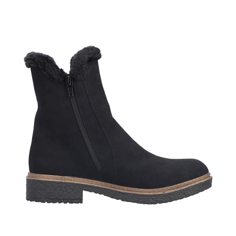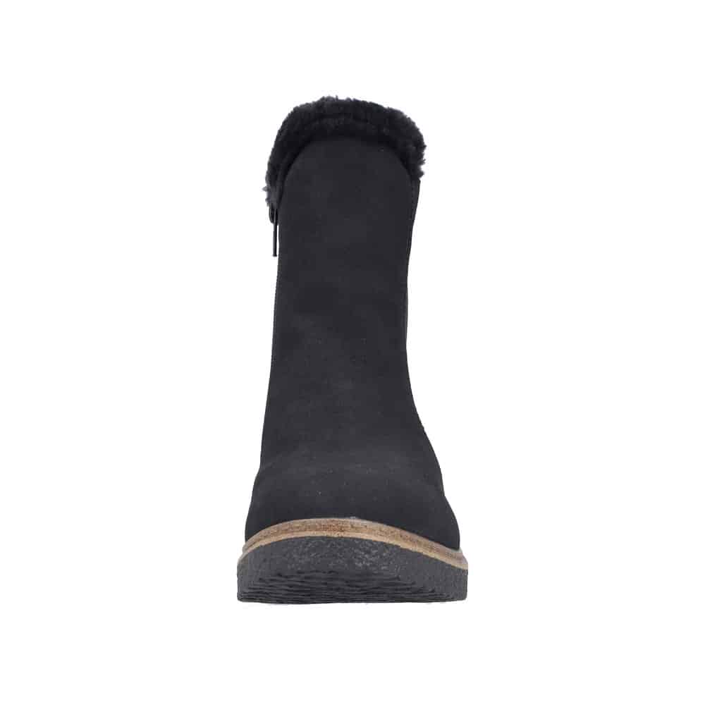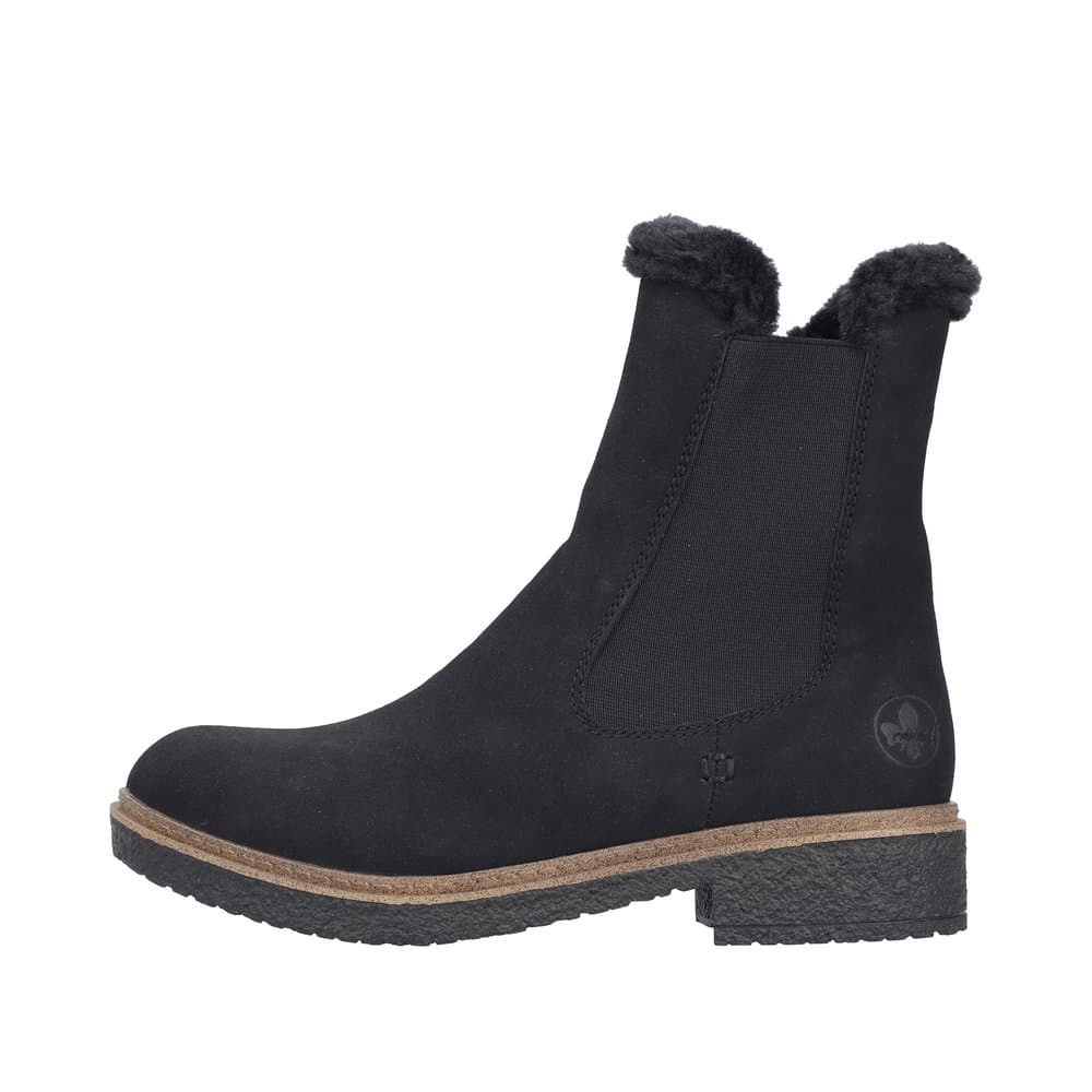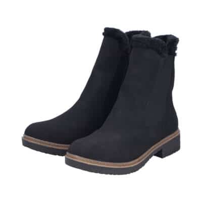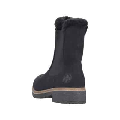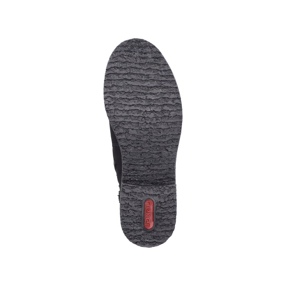 Rieker støvle til dame i sort. Stilfuld støvle i klassisk sort, perfekt til hverdagen. Den funktionelle lynlås og elastik gør det hurtigt at komme i og af støvlen, og indvendigt mødes du af en varm foring og en blød sål for optimal komfort. Den mønstrede ydersål giver øget stødabsorbering og skridsikkerhed, så du får komfort i hvert et skridt.