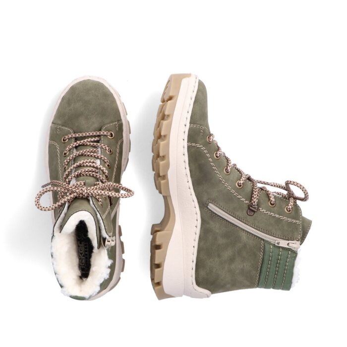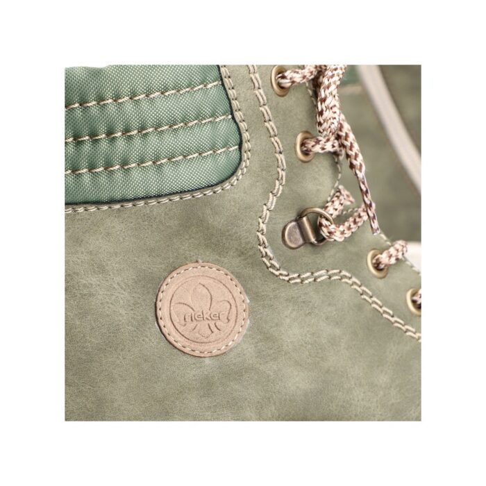 Rieker Støvle i Grøn til Dame. Super flot støvle i en lækker grøn farve, modellen har nogle flotte syninger samt har modellen nogle flotte farver i snøren. Modellen har en lynlås på indersiden som dermed gør den nem at komme i/af.