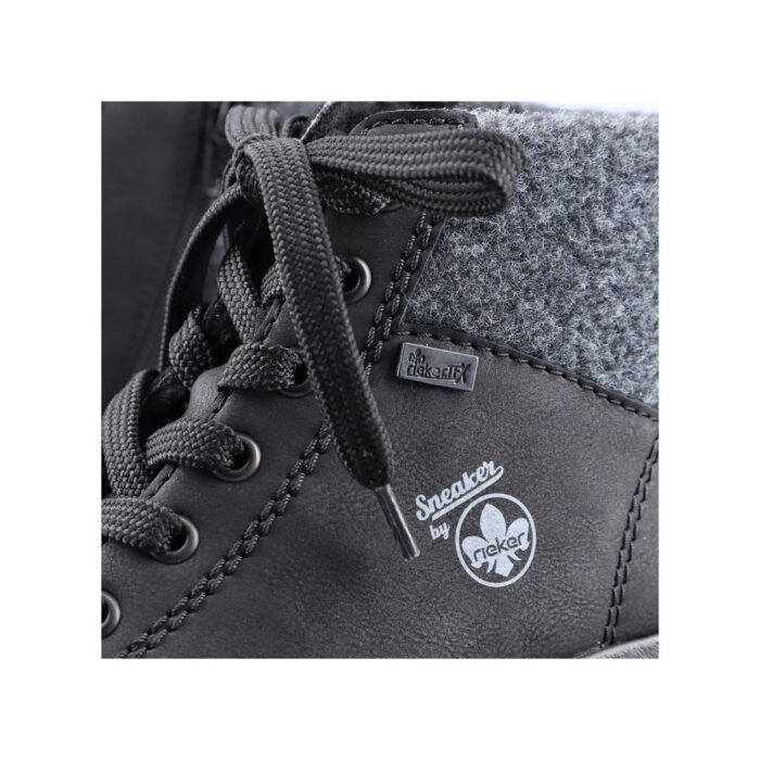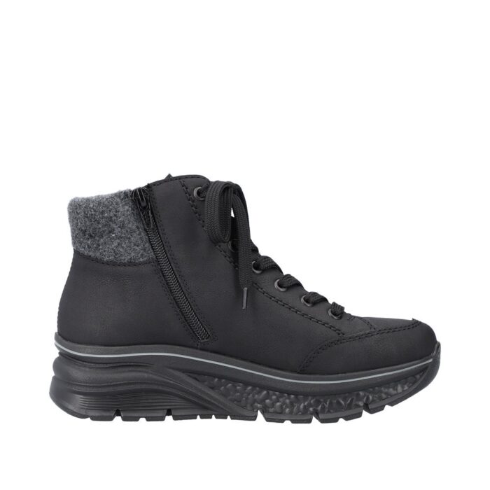 Rieker Støvle i Sort til Dame. Super lækker let støvle i et chunky look. Modellen er kraftigt foret samt kraftigt vandtæt. Støvlen har en funktionel lynlås samt nogle flotte detaljer langs sålen. Modellen har mulighed for at fjerne sålen efter behov.