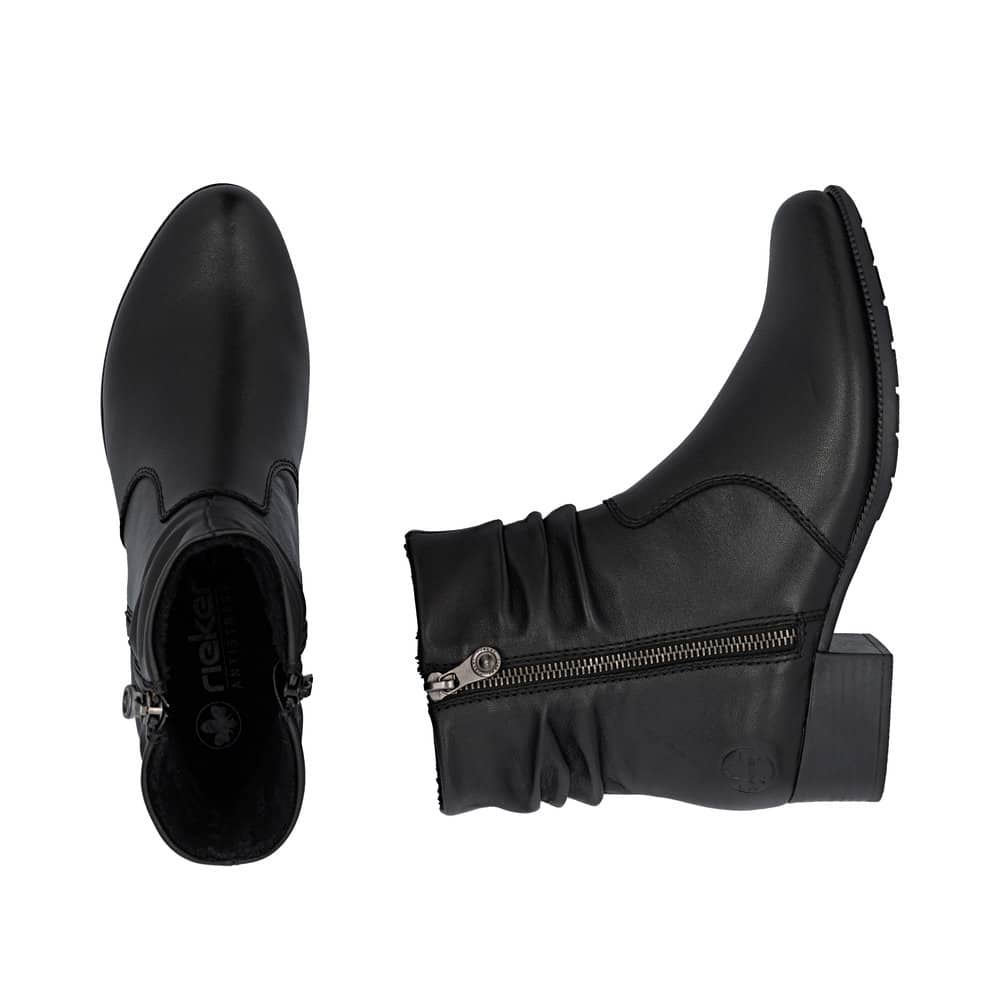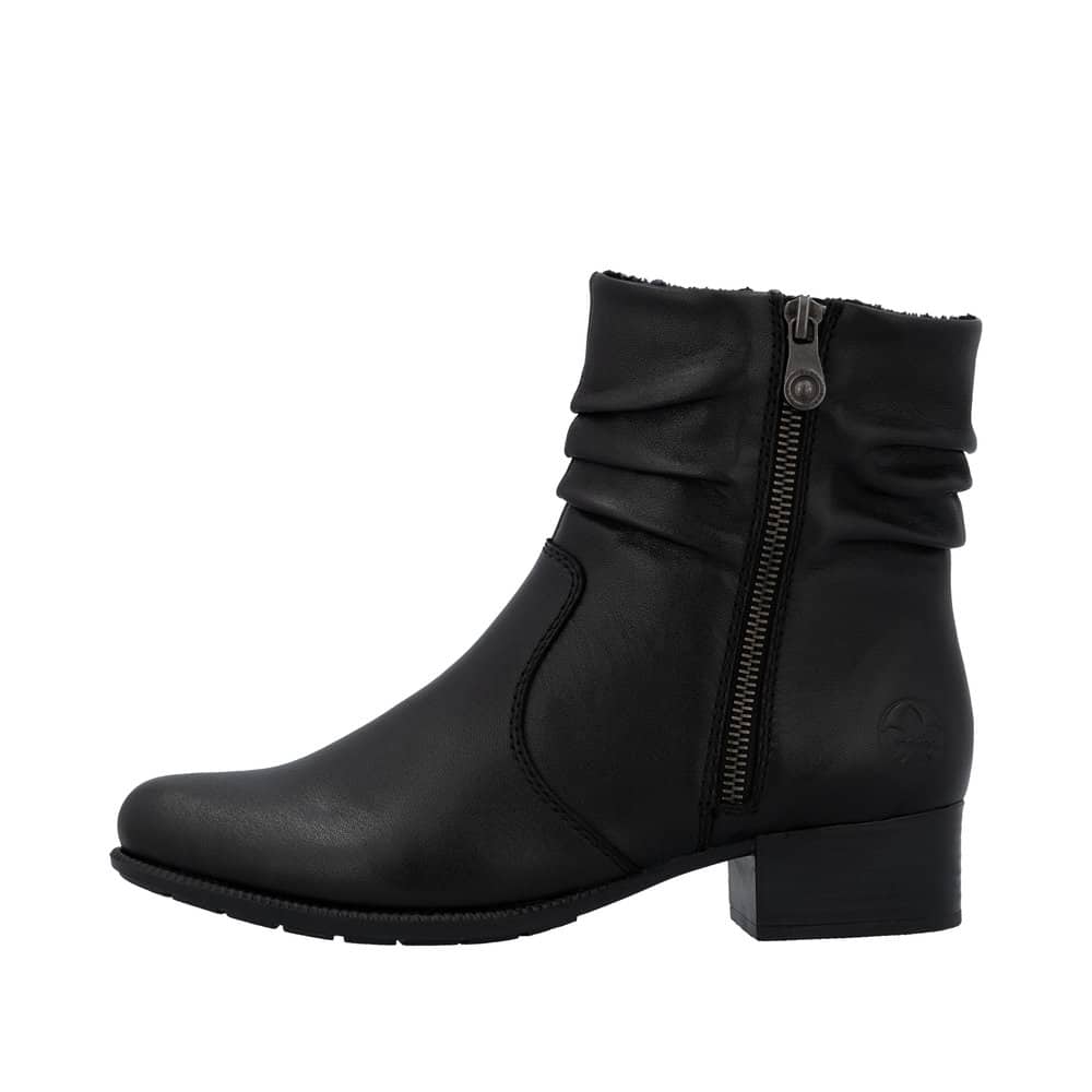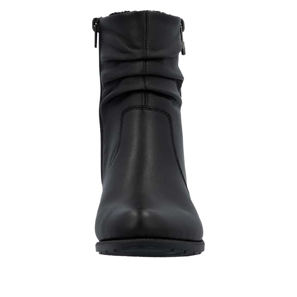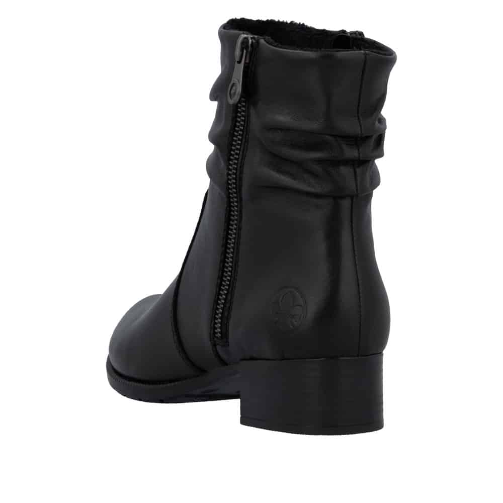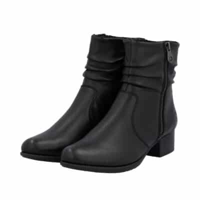 Rieker støvle til dame i sort. Stilfuld støvle med skindoverdel og rynkede detaljer, der giver et flot og elegant udtryk. Modellen har lynlås på begge sider der gør det let at tage støvlen af og på, mens den bløde indersål og lette foring giver høj komfort. Med en hæl på 3,5 cm får støvlen et smukt løft, og den mønstrede ydersål giver øget stødabsorbering og skridsikkerhed.