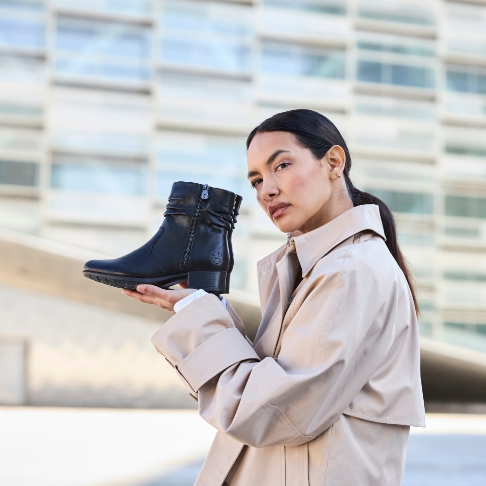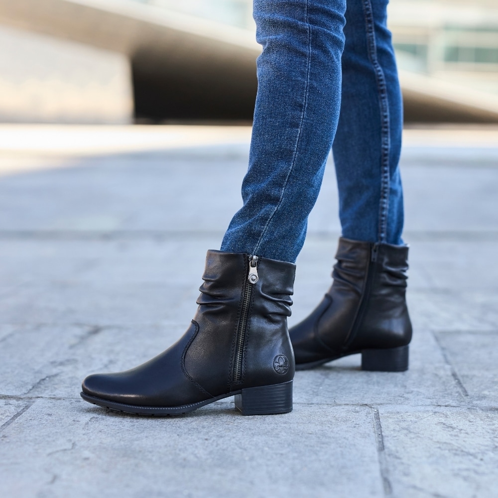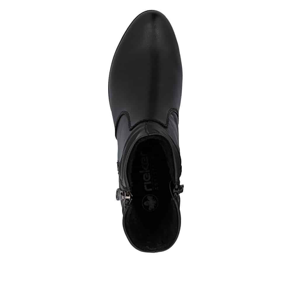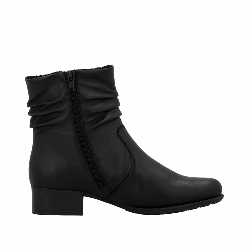 Rieker støvle til dame i sort. Stilfuld støvle med skindoverdel og rynkede detaljer, der giver et flot og elegant udtryk. Modellen har lynlås på begge sider der gør det let at tage støvlen af og på, mens den bløde indersål og lette foring giver høj komfort. Med en hæl på 3,5 cm får støvlen et smukt løft, og den mønstrede ydersål giver øget stødabsorbering og skridsikkerhed.