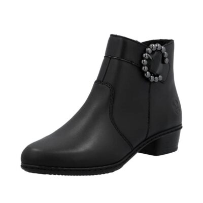 Rieker støvle til dame i sort. Bliv klar til at shine med disse stilrene sorte ankelstøvler, der giver din garderobe et strejf af elegance. Lynlåsen på siden gør det supernemt at tage dem af og på. Den lette og stødabsorberende sål sikrer dig en behagelig gang hele dagen, mens den bløde indersål giver dine fødder en luksuriøs følelse. Med det varme for holdes dine fødder dejligt varme, så du kan tage vinteren med stil og komfort.