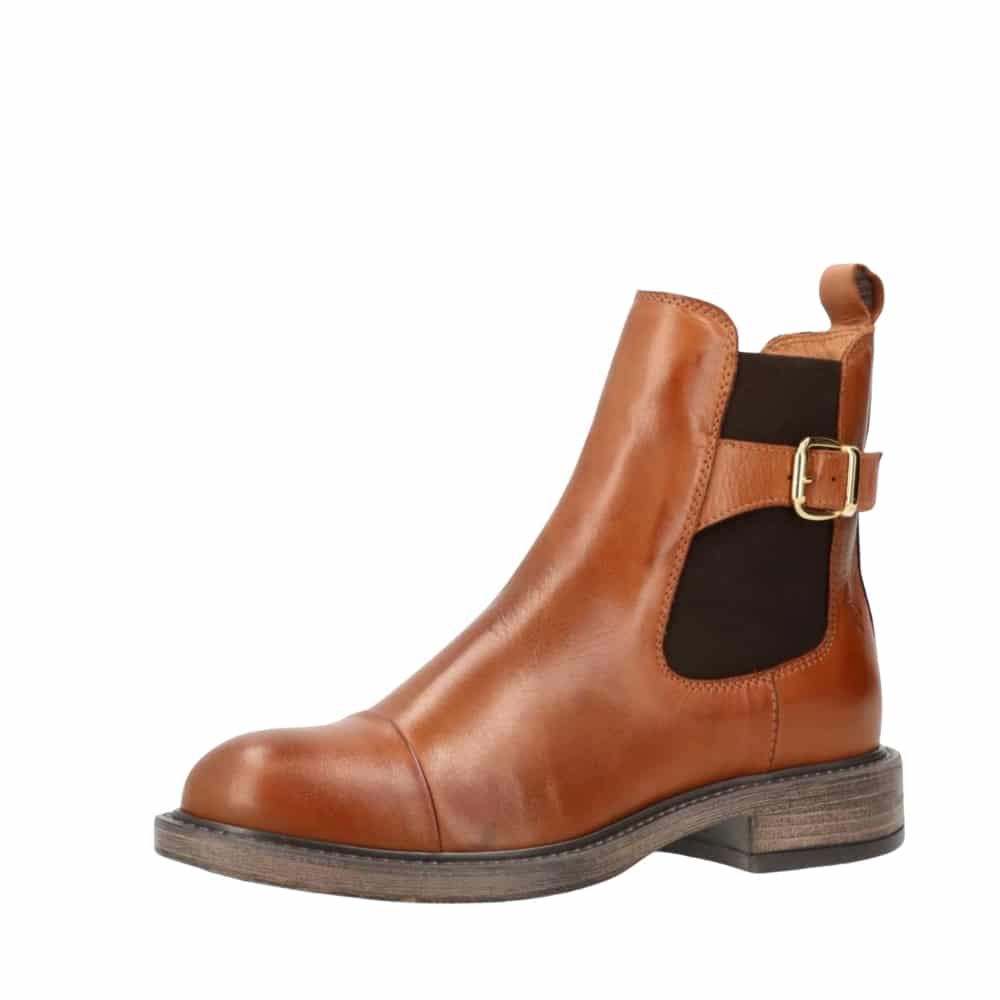 Shoedesign Copenhagen Beatrice støvle til dame i cognac. Denne cognacfarvede støvle kombinerer klassisk elegance med moderne detaljer. Den gyldne spænde på siden fremhæver designet, mens elastikken og lynlåsen på indersiden gør det nemt at tage støvlen på og giver en god pasform. Indvendigt finder du en blød sål, der sørger for komfort hele dagen. Hælen på ca. 3 cm tilfører et stilfuldt løft, og den solide ydersål med mønster giver øget skridsikkerhed.