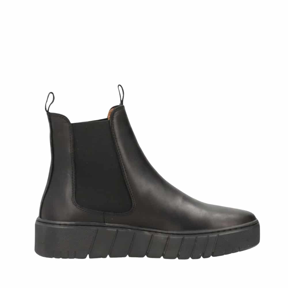 Shoedesign Copenhagen Mooved BLK støvle til dame i sort. Denne sorte chelseastøvle i glatskind er et oplagt valg, hvis du ønsker både stil og funktionalitet. Støvlen er udstyret med elastiske sider, som gør den praktisk og nem at få på, mens den bløde indersål i skind sikrer en god komfort hele dagen. Kilehælen på ca. 4 cm giver et elegant løft, og den sorte gummisål med mønster sørger for øget støtte og skridsikkerhed.