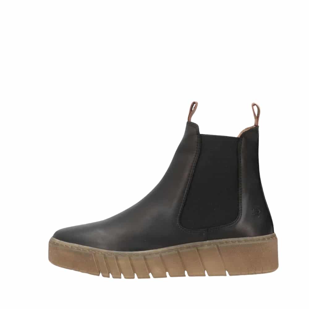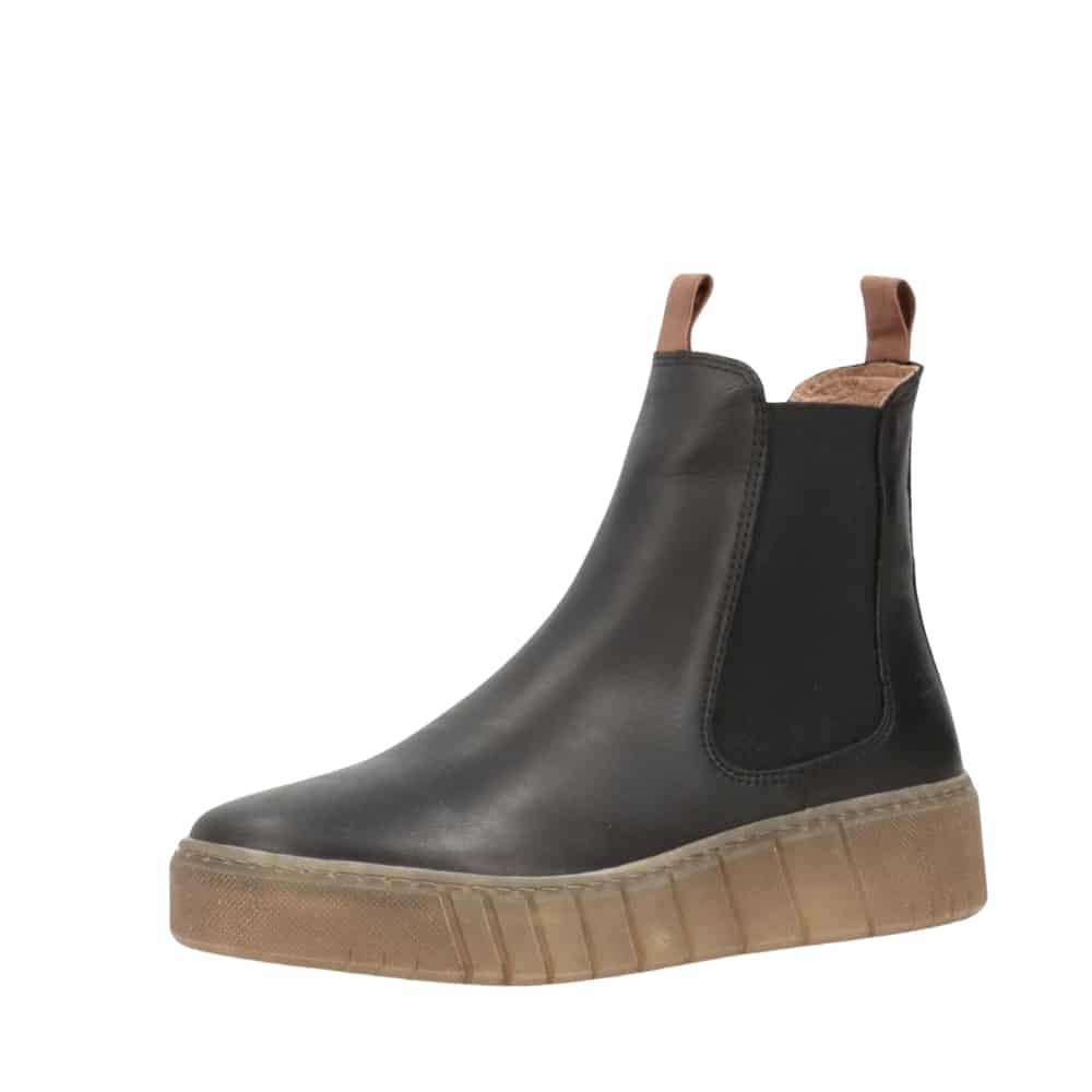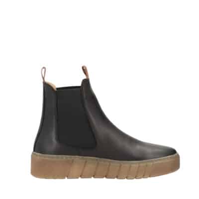 Shoedesign Copenhagen Mooved støvle til dame i sort. Denne sorte chelseastøvle er et godt valg til dig, der ønsker både stil og komfort. Overdelen i glatskind giver et klassisk look, og med elastikken i siderne er støvlen nem at tage af og på. Indvendigt er der en blød indersål i skind, der sikrer god komfort, mens den ca. 4 cm høje kilehæl giver et elegant løft. Den brune gummisål med godt mønster sørger samtidig for støtte og øget skridsikkerhed gennem hele dagen.
