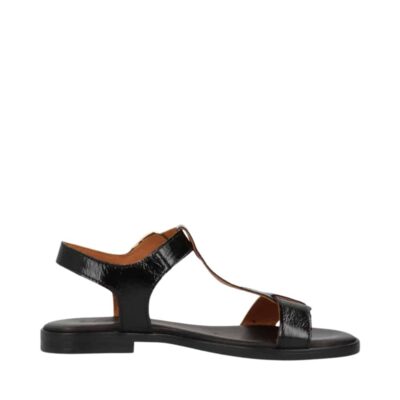 Shoedesign Copenhagen Nora P sandal til dame i sort lak. Moderne sandal i klassisk sort med en elegant lakoverdel, der giver et unikt look. Sandalen er lavet af 100% skind og har en stilfuld rem over forfoden, der smukt forbinder sig med en ankelrem. Den justerbare, gyldne spænde giver en fleksibel pasform og gør det let at tage sandalen af og på. Den bløde indersål sikrer langvarig komfort, mens den fleksible ydersål med mønster giver ekstra stabilitet og tryghed ved hvert skridt.