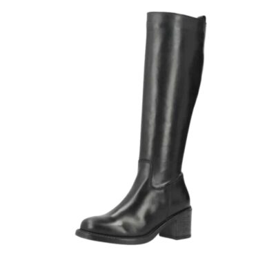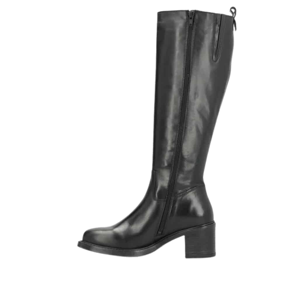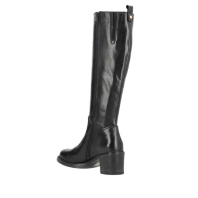 Shoedesign Copenhagen Nevada lang støvle til dame i sort. Stilfuld støvle i skind med langt skaft, der giver et feminint og tidløst udtryk. Den praktiske lynlås på indersiden gør den let at tage på, mens overdelen i blødt skind sikrer en behagelig pasform. Med en elegant hæl på ca. 6,5 cm får du et smukt løft, der understreger støvlens eksklusive design, uden at det går ud over komforten.