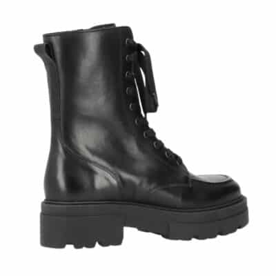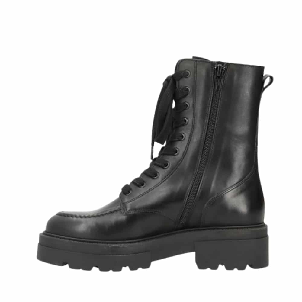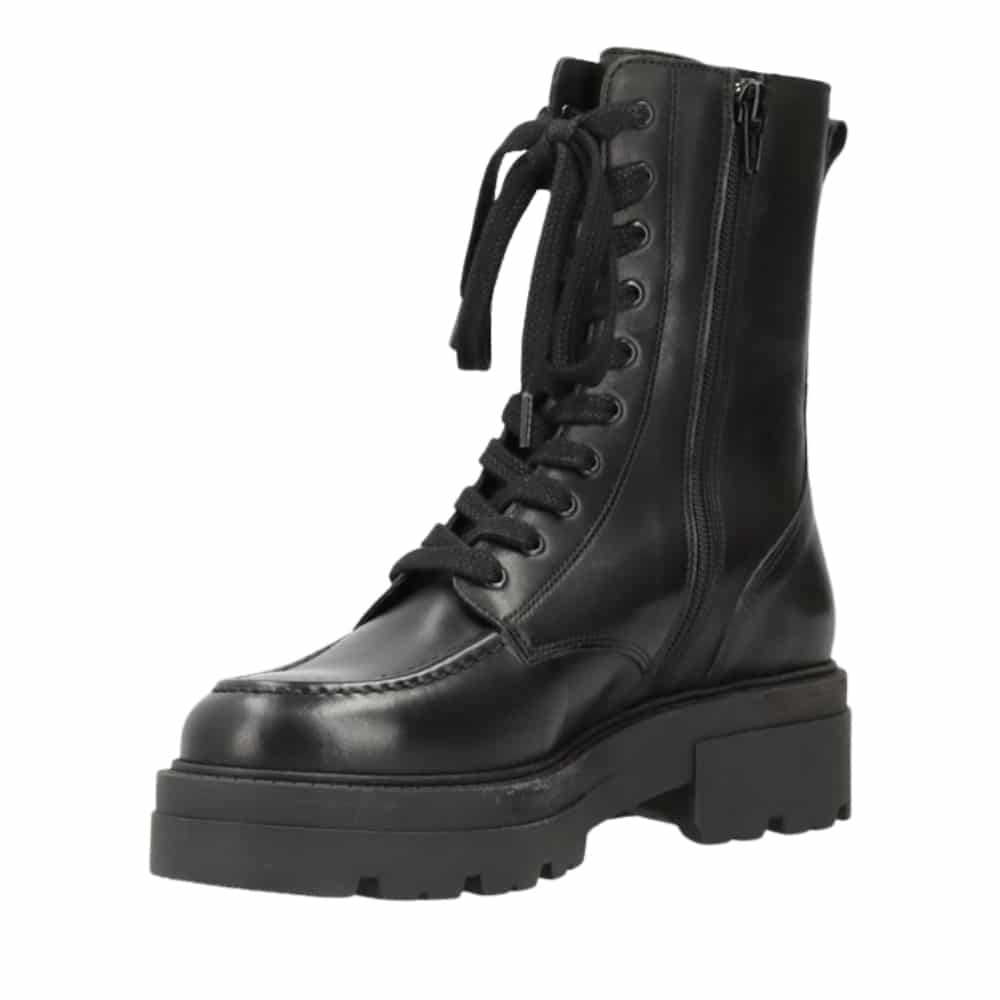Shoedesign Copenhagen Valley støvle til dame i sort. Denne sorte støvle i 100% skind kombinerer klassisk design med komfortable detaljer. Støvlen er udstyret med snørebånd og en praktisk lynlås, så du nemt kan tage støvlen af og på. Indvendigt giver den bløde skindsål en behagelig komfort hele dagen, mens den chunky ydersål på ca. 4,5 cm giver et moderne løft og øget skridsikkerhed.