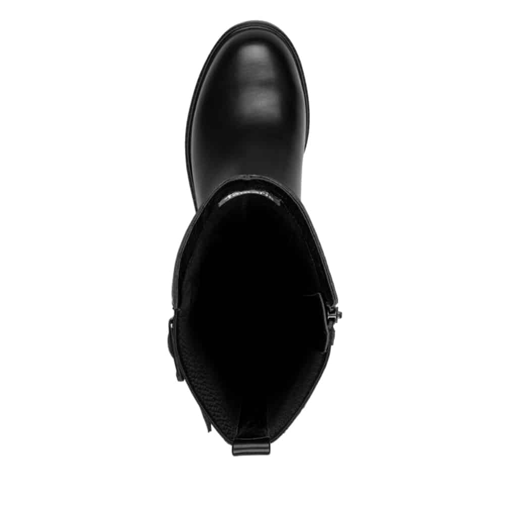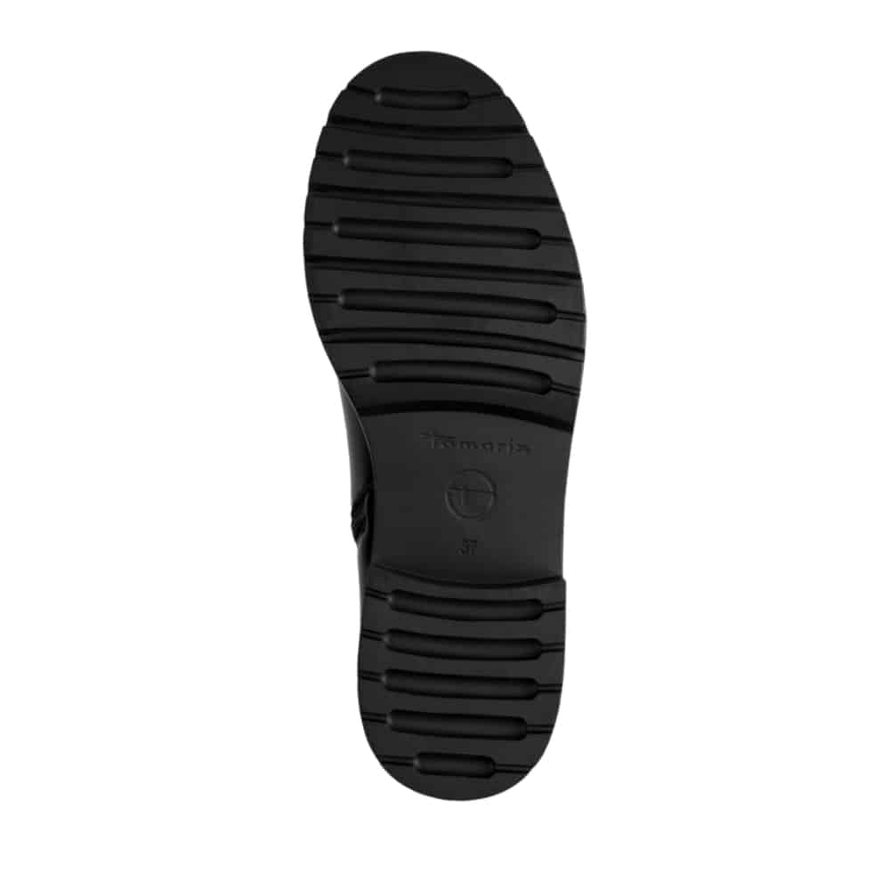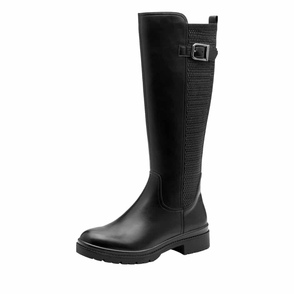 Tamaris lang støvle til dame i sort. Denne sorte støvle kombinerer klassisk elegance med moderne detaljer. Spændet på siden giver et feminint touch, mens lynlåsen på indersiden og elastikken bagpå gør det nemt at få støvlen af og på og sikrer en god pasform. Indvendigt sørger en let foring og en blød, udtagelig indersål med Touch-It teknologi for høj komfort hele dagen, da sålen tilpasser sig fodens naturlige form. Med en blokhæl på ca. 5 cm får du et smukt løft, som gør støvlen velegnet til både hverdag og finere anledninger.