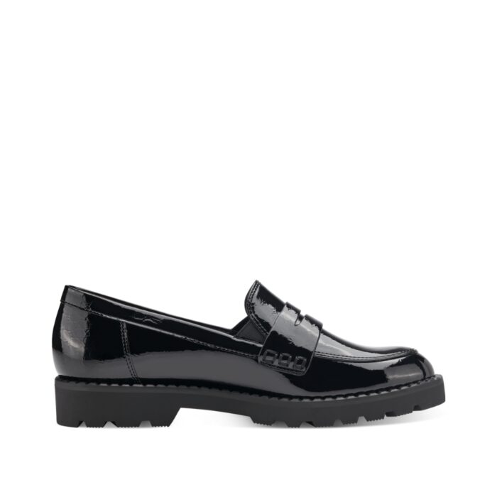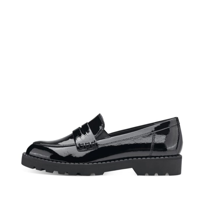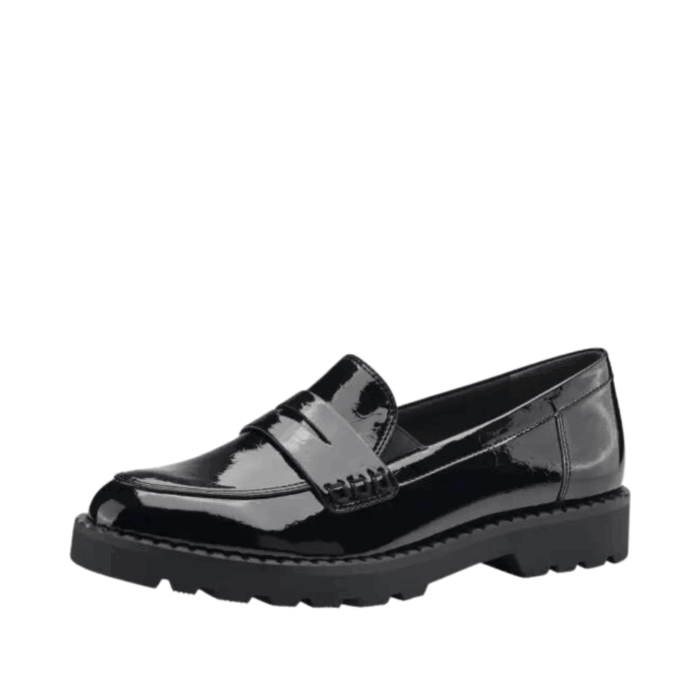 Tamaris loafers i sort til dame. Lækker chunky loafers fra Tamaris, i et smart lak look. Modellen har en dejlig blød overflade, samt flotte detaljer foran. Dejlig nem at komme i/af.
