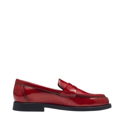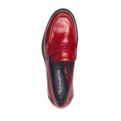 Tamaris loafers til dame i rød lak. Moderne røde loafers med en elegant lakoverdel, der giver et stilrent og trendy udtryk. Skoen er designet med en fin detalje over forfoden og er let at tage på. Indvendigt sikrer en blød indersål med Touch-It teknologi høj komfort ved at tilpasse sig fodens form. Den lille hæl tilfører et feminint touch, mens den skridsikre ydersål giver ekstra stabilitet.