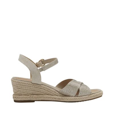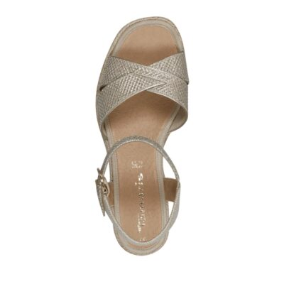 Tamaris sandal til dame i guld. Trendy guldfarvet sandal med smukke glimmerdetaljer, der giver et moderne og elegant udtryk. Den krydsede rem foran og den justerbare velcrorem sikrer en velsiddende og komfortabel pasform. Sandalen har en kilehæl på ca. 5,5 cm, der giver et feminint løft samtidig med høj komfort. Den mønstrede ydersål er udstyret med Antislide-teknologi, der øger skridsikkerheden og giver ekstra støtte.