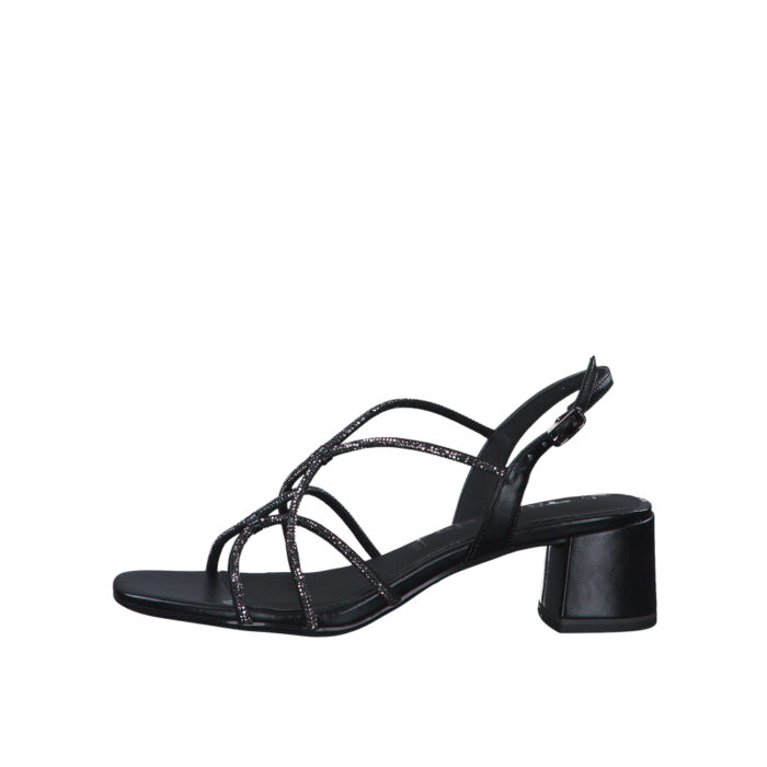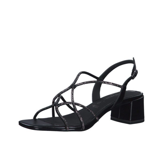 Tamaris Sandal i Sort/Glimmer til Dame. Fineste sandal i sort med flotte glimmer detaljer. Modellen har en justerbar rem i siden. Modellen har en hælhøjde på ca. 5,5cm.