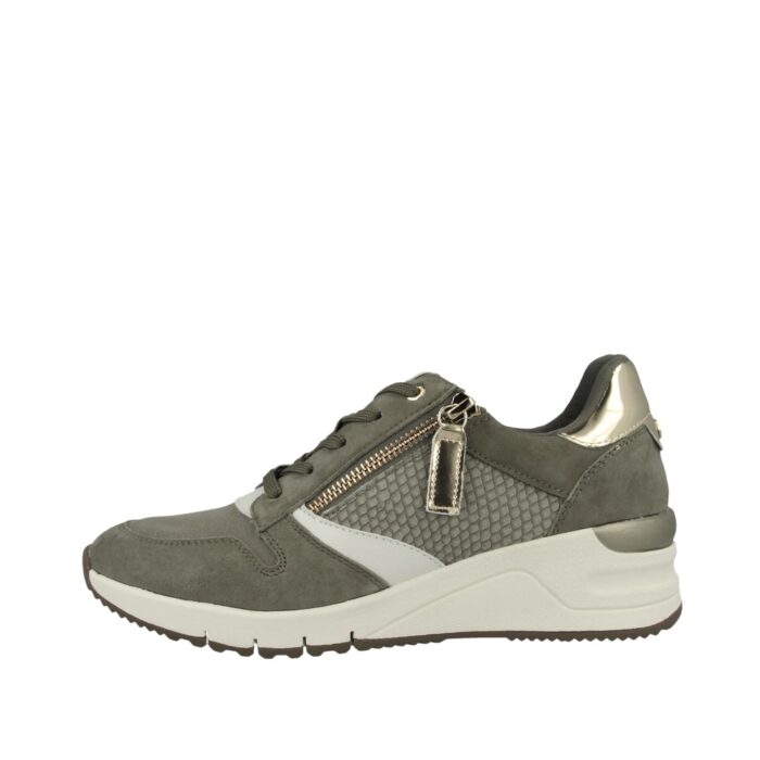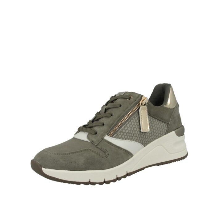 1-23702-28 Tamaris Sneakers i Army til Dame. Super smart sneakers fra Tamaris, i en flot army grøn farve. Modellen har mange fine detaljer, samt snøre og lynlås så den er nem at hoppe i/af.