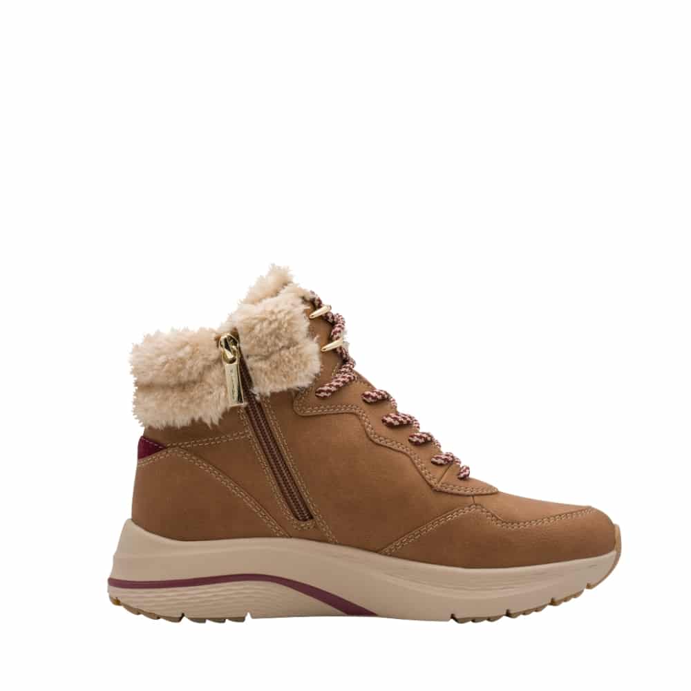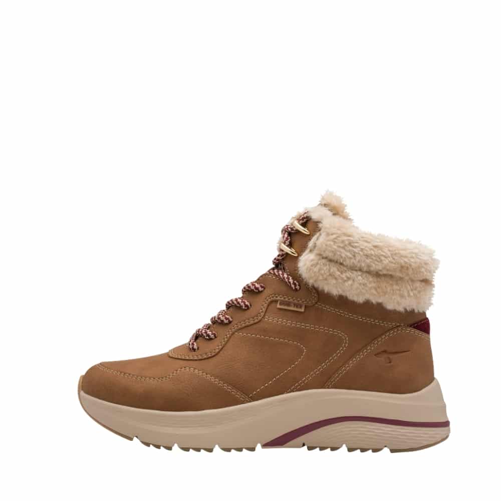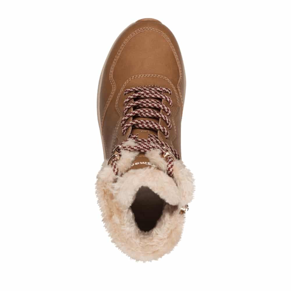 Tamaris støvle til dame i brun. Denne flotte vinterstøvle i brun er designet til at kombinere komfort og stil. Snørebåndet foran gør det muligt at justere pasformen, og den funktionelle lynlås på indersiden sikrer, at støvlen er nem at tage af og på. Indvendigt har støvlen en varm foring og en blød udtagelig sål, der holder fødderne varme selv på kolde dage. Takket være DUO-Tex er støvlen kraftigt vandafvisende, mens den chunky ydersål med mønster giver øget støtte og skridsikkerhed.