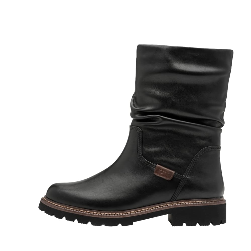 Tamaris støvle til dame i sort. Elegant sort støvle med rynket detalje, perfekt til dig der vil have både komfort og et moderne look. Lynlåsen på siden gør det nemt at komme i og af støvlen, mens den bløde Touch-It sål og den lette foring giver optimal komfort hele dagen. Den solide ydersål er udstyret med et godt mønster, der giver øget støtte og sikrer skridsikkerhed.
