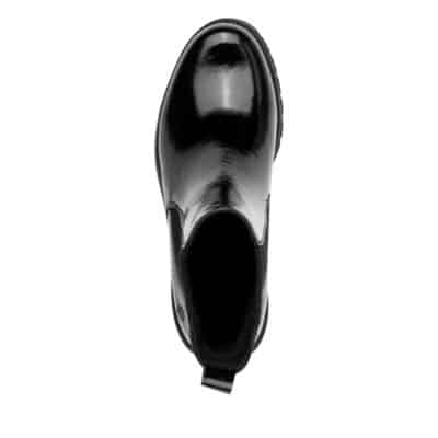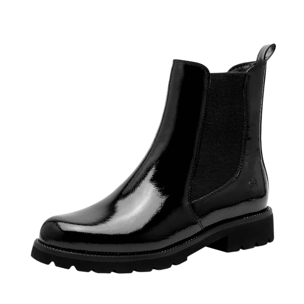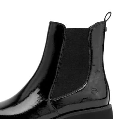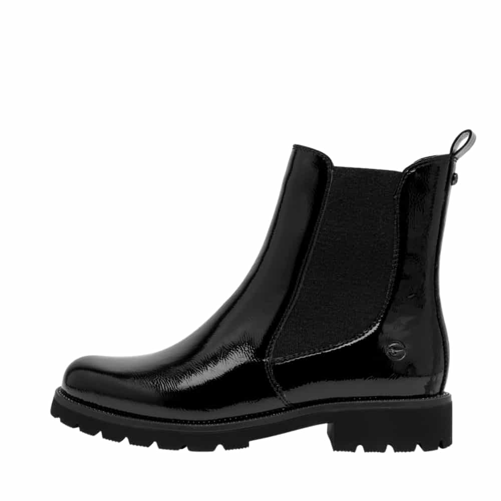 Tamaris chelseastøvle til dame i sort lak med let foring og chunky ydersål