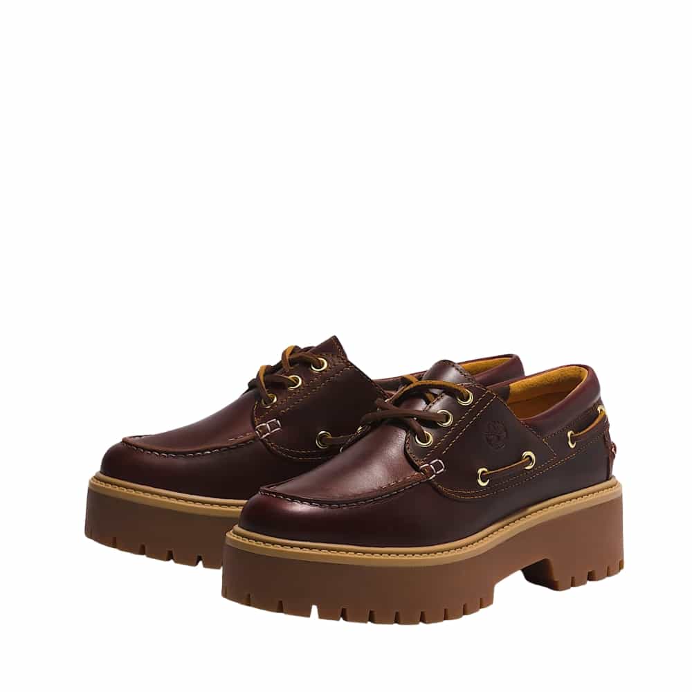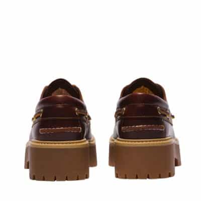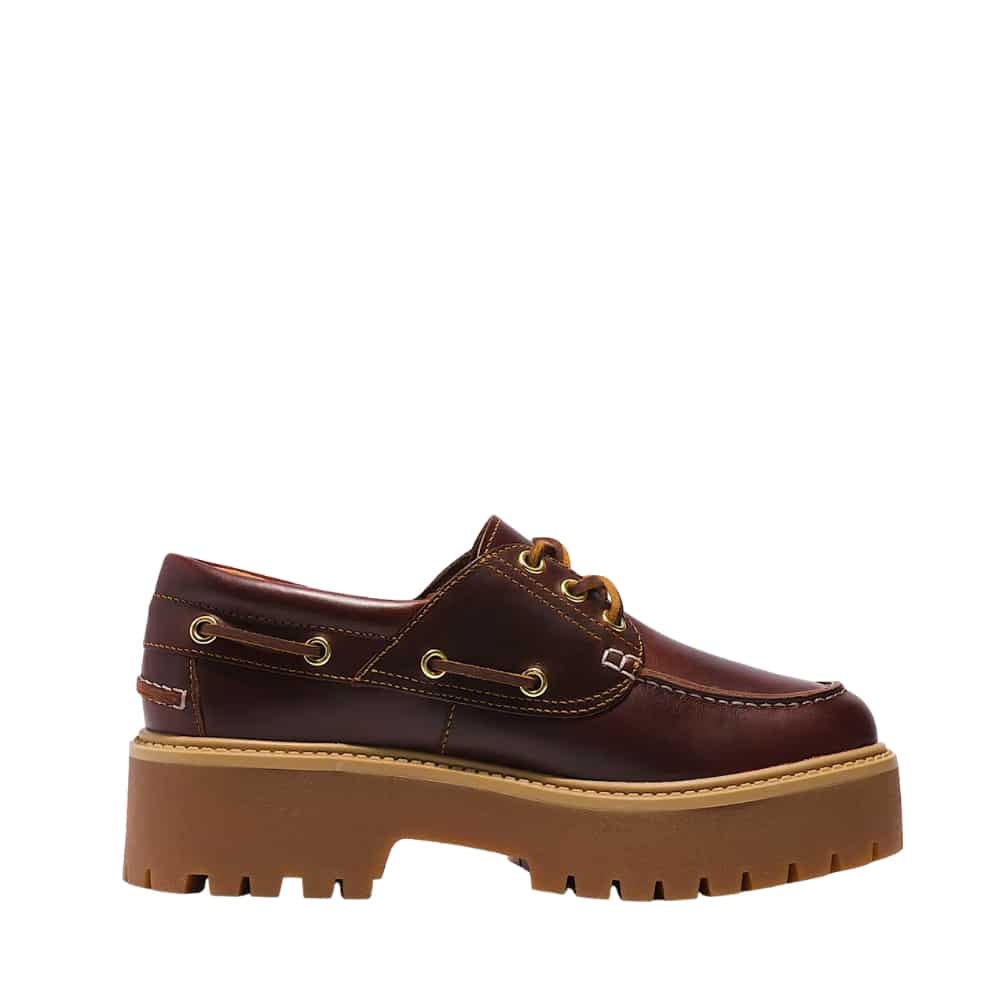 Timberland Stone Street sejlersko til dame i mørkebrun. Moderne sejlersko i mørkebrun med gennemførte detaljer, der giver et flot og moderne look. Overdelen er lavet i 100% ægte læder, og lædersnørebåndene foran og i siderne bidrager både til pasform og stil. Indvendigt har skoen en blød og udtagelig OrthoLite® indersål, som giver god komfort hele dagen. Den chunky plateausål på ca. 5 cm. i gummi giver stabil støtte og øget skridsikkerhed.