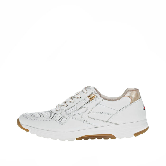Gabor Soft Sneakers i Hvid til Dame. Super lækker sneakers med flotte guld detaljer. Overdellen er af en fin skind kvalitet. Modellen har en funktionel lynlås på ydersiden, der dermed gør den nem at komme i/af. Modellen har en aftagelig sål