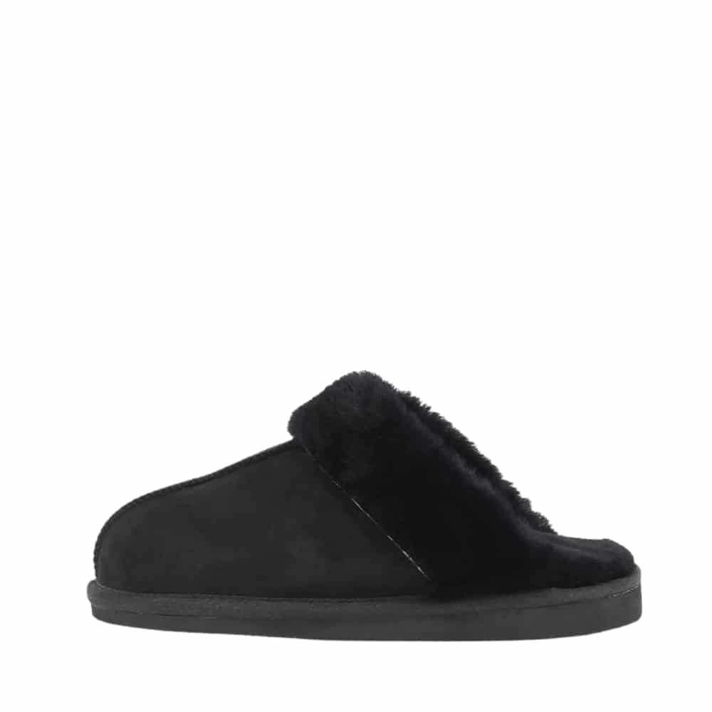 Woollies hjemmesko til dame i sort. Denne hjemmesko kombinerer komfort og funktionalitet med sit bløde ruskind og det varme for af lammeskind. Pelskraven udenpå giver et stilfuldt udtryk, mens den indvendige lammeskindskvalitet sikrer en blød og behagelig fornemmelse. Uden hælkap er den praktisk og let at bruge i hverdagen.
